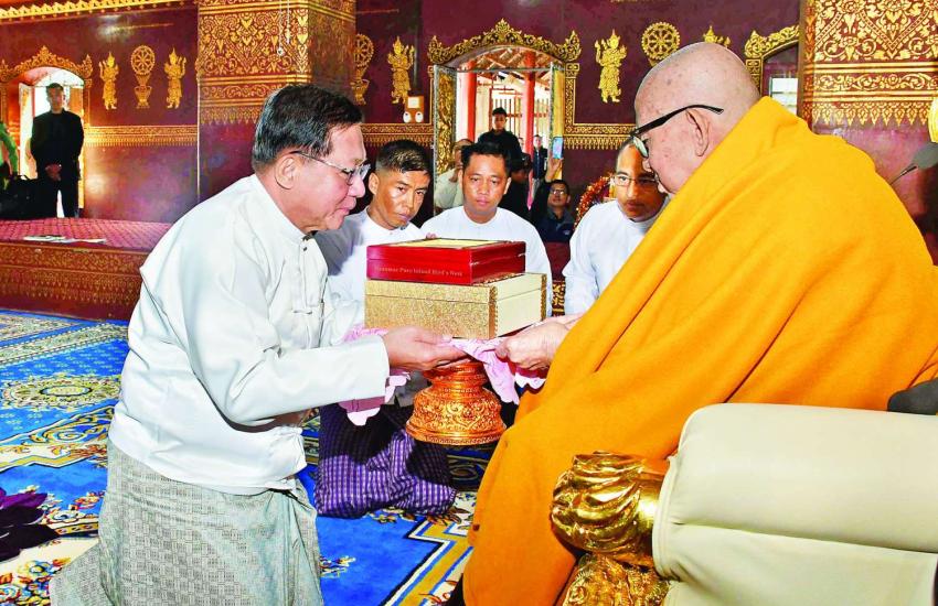 - ပြည်ထောင်စုသမ္မတမြန်မာနိုင်ငံတော်ယာယီသမ္မတ နိုင်ငံတော်လုံခြုံရေးနှင့်အေးချမ်းသာယာရေးကော်မရှင်ဥက္ကဋ္ဌ ဗိုလ်ချုပ်မှူးကြီး မင်းအောင်လှိုင် ကျိုင်းတုံမြို့ ကျိုင်းယင်းကျောင်းတိုက်ဦးစီးပဓာနနာယက သက်တော်ရှည် မဟာထေရ်မြတ်ကြီးအား ချီးမြှင့်ထားရှိသည့် “စည်သူဘွဲ့” တံဆိပ်တော်များနှင့် အဆောင်အယောင်များကို လက်ရောက်ဆက်ကပ်လှူဒါန်း