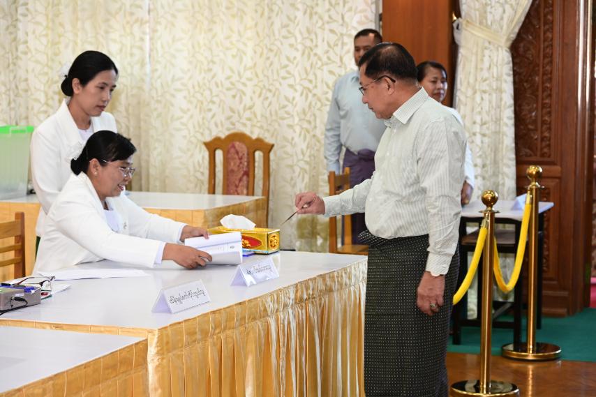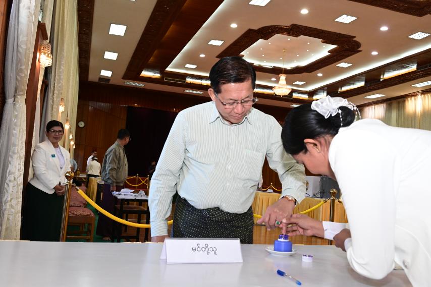 Acting President of the Republic of the Union of Myanmar and State Security and Peace Commission Chairman Senior General Min Aung Hlaing, together with Commission Vice-Chairman Deputy Commander-in-Chief of Defence Services Commander-in-Chief (Army) Vice-Senior General Soe Win and his wife Daw Than Than Nwe, Secretary of the Commission General Ye Win Oo and his wife, Commission member Chief of the General Staff (Army, Navy and Air) General Kyaw Swa Lin and his wife, senior Tatmadaw officers from the Office of the Commander-in-Chief and their wives, Tatmadaw members and families, cast votes at the polling station No 1 in Anawrahta Ward of Zeyathiri Township in Nay Pyi Taw Council Area.