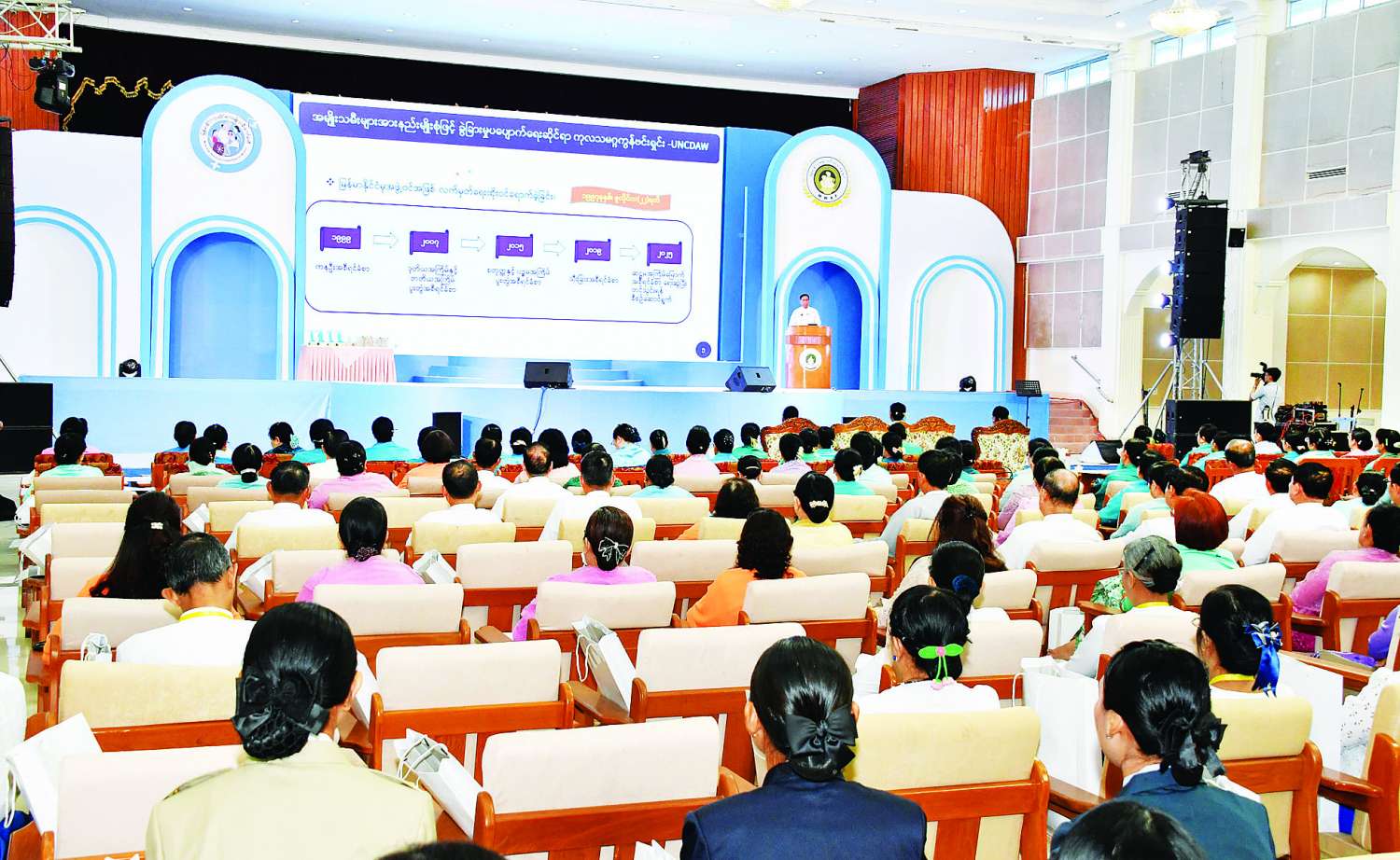 Chairman of the Myanmar National Women’s Committee, Union Minister for Social Welfare, Relief and Resettlement, Dr Soe Win, explained empowerment of women, raising rights of women and Prevention and protection against various forms of violence against women.