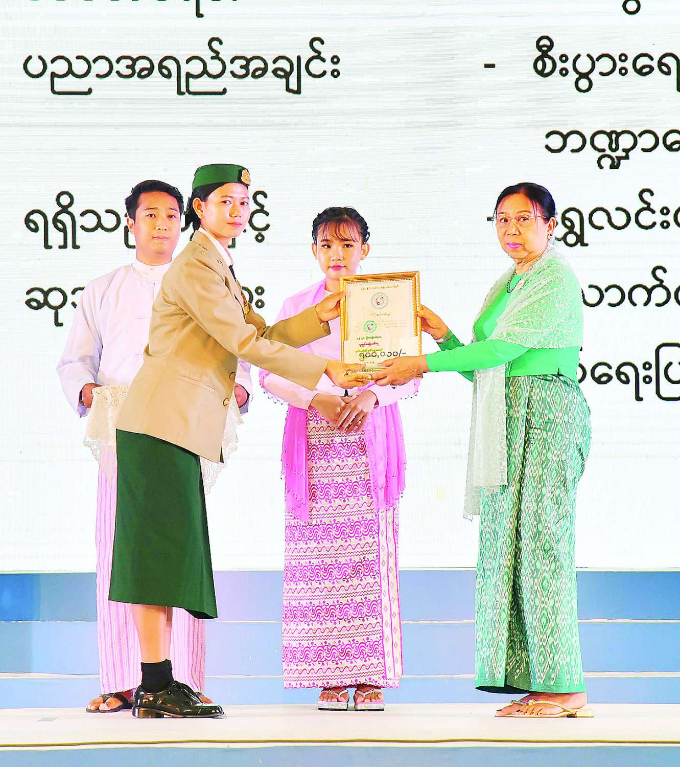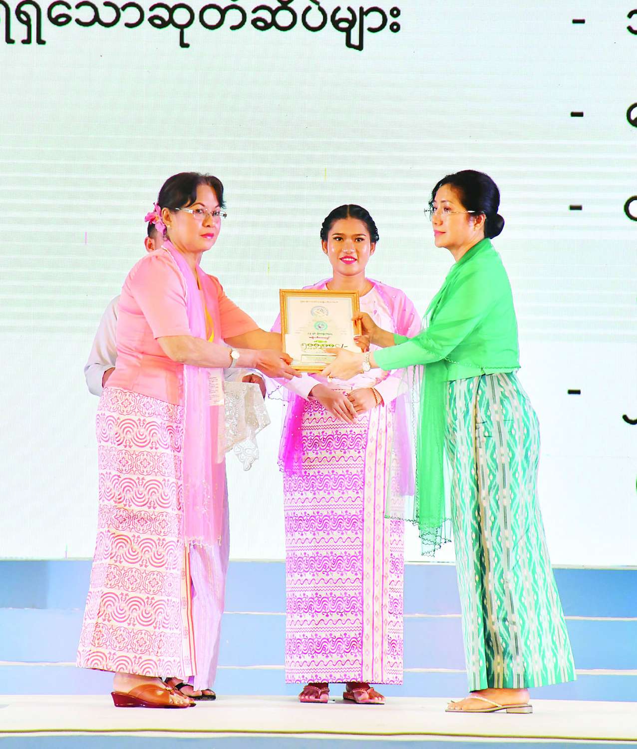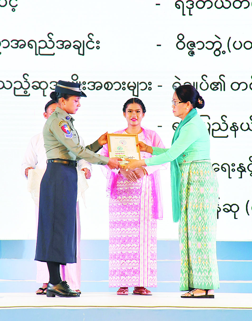 The wife of the SAC Secretary presented the honorary medal, certificate and cash award to Daw Cho Cho Maw and Daw Khin Wutyi, on behalf of 2023 National Literary Award winner Daw Mya Mya Than and the wife of the Joint Secretary to outstading female award winner Dr Thin Myo Myo Aung and female entrepreneurship award winner Daw Kyway Kyway Zin, respectively.