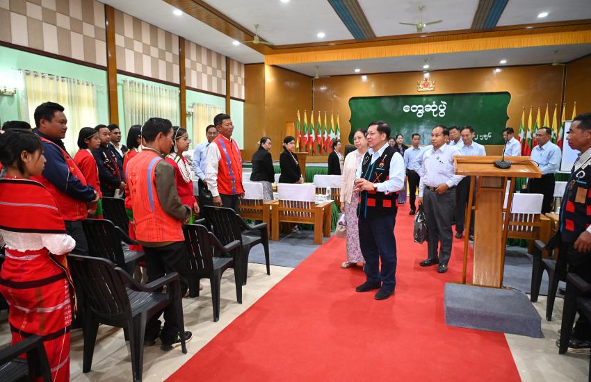 - ပြည်ထောင်စုသမ္မတမြန်မာနိုင်ငံတော်ယာယီသမ္မတ နိုင်ငံတော်လုံခြုံရေးနှင့်အေးချမ်းသာယာရေးကော်မရှင်ဥက္ကဋ္ဌ ဗိုလ်ချုပ်မှူးကြီး မင်းအောင်လှိုင် ကျိုင်းတုံမြို့ရှိ ဌာနဆိုင်ရာတာဝန်ရှိသူများ၊ မြို့မိမြို့ဖများနှင့်တွေ့ဆုံ၍ ဒေသဖွံ့ဖြိုးတိုးတက်ရေးဆိုင်ရာများဆွေးနွေး
