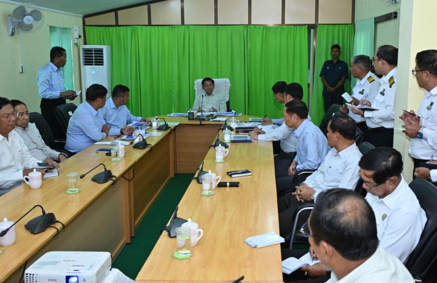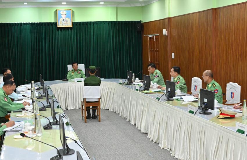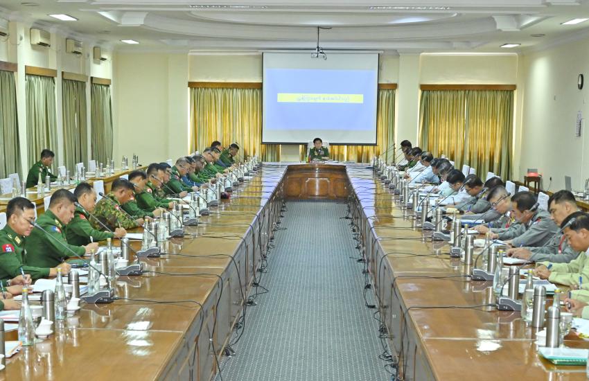 State Administration Council Chairman Prime Minister Senior General Min Aung Hlaing addresses the meeting on security and development of Yangon Region