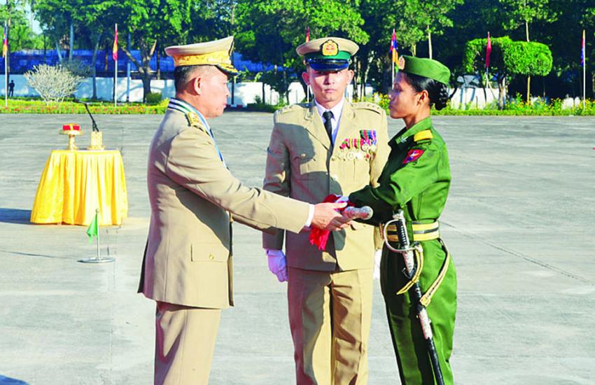 Vice-Senior General Soe Win, State Security and Peace Commission Vice-Chairman, Defence Services Deputy C-in-C, Commander-in-Chief (Army), warmly greets the outstanding students