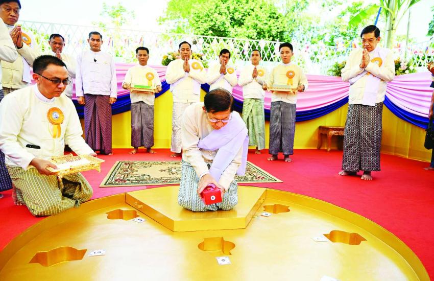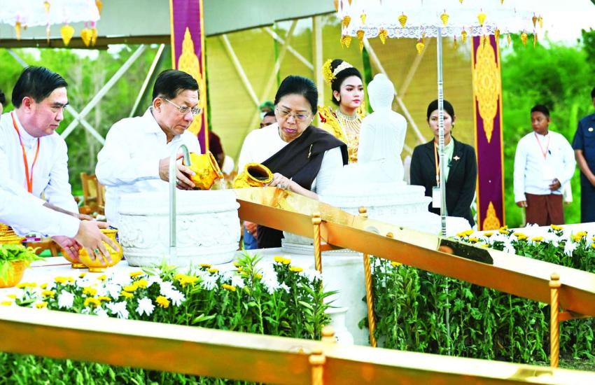 SAC Chairman Prime Minister Senior General Min Aung Hlaing and his wife Daw Kyu Kyu Hla, council members and their wives pour water on banyan trees