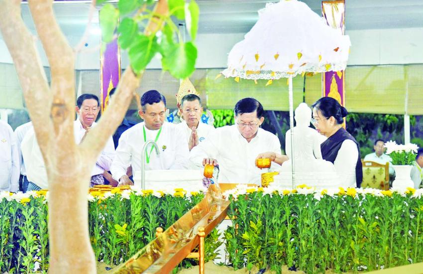 SAC Chairman Prime Minister Senior General Min Aung Hlaing, his wife Daw Kyu Kyu Hla, pour water on banyan trees on full moon of Kason