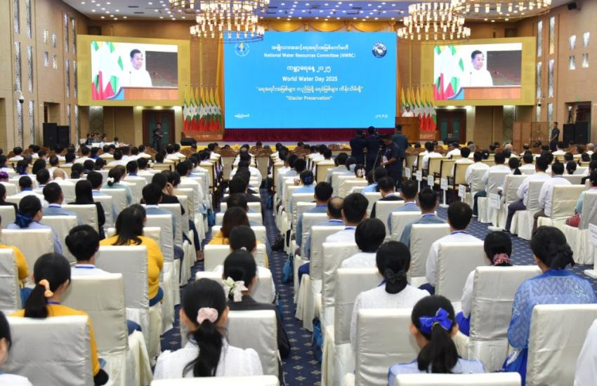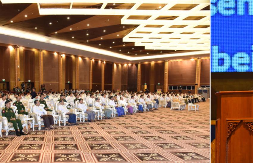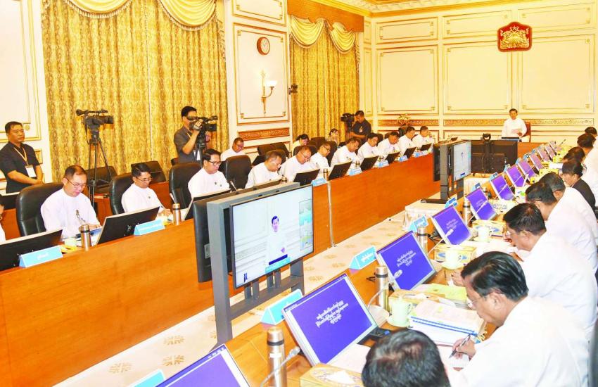 State Administration Council Chairman Prime Minister Senior General Min Aung Hlaing addresses the National Planning Commission meeting in Nay Pyi Taw yesterday