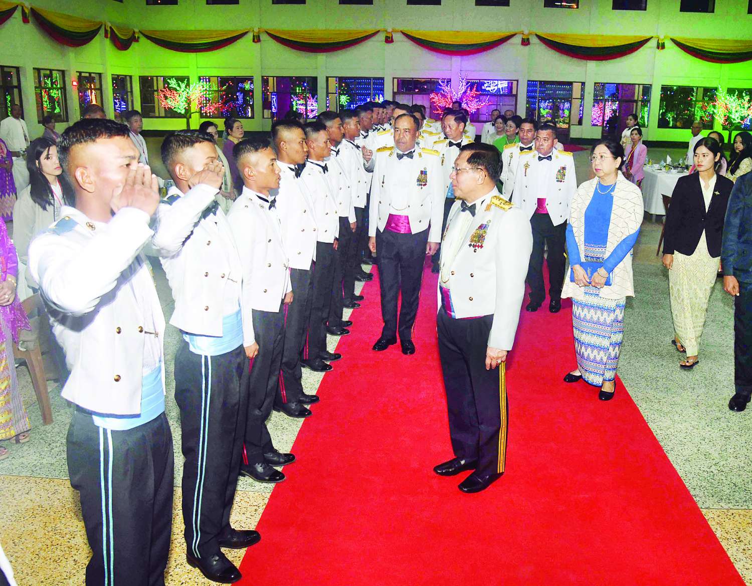 Also present at the dinner were Commander-in-Chief (Navy) Admiral Htein Win and his wife, Commander-in-Chief (Air) General Tun Aung and his wife, senior Tatmadaw officers from the Office of the Commander-in-Chief and their wives, Union-level dignitaries and Union Ministers and their wives, the Chief Minister of Mandalay Region, commanders, the DSA commandant, officials of the PyinOoLwin Station, parents and relatives of the graduating officers, and other guests.