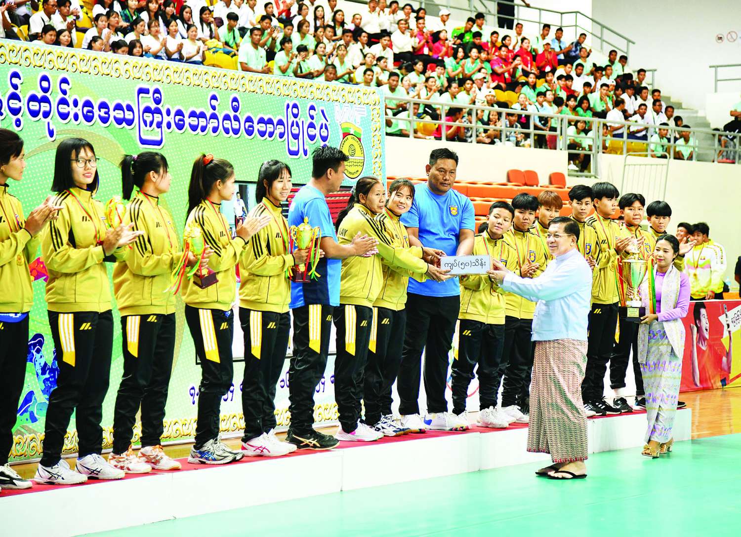 Chairman of the State Administration Council Prime Minister Senior General Min Aung Hlaing presented cash awards and championship trophies to the Shan State men’s team and Mandalay Region women’s team and cordially greeted players at the prize-awarding ceremony at Wunna Theikdi Gymnasium C in Nay Pyi Taw yesterday.