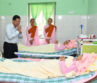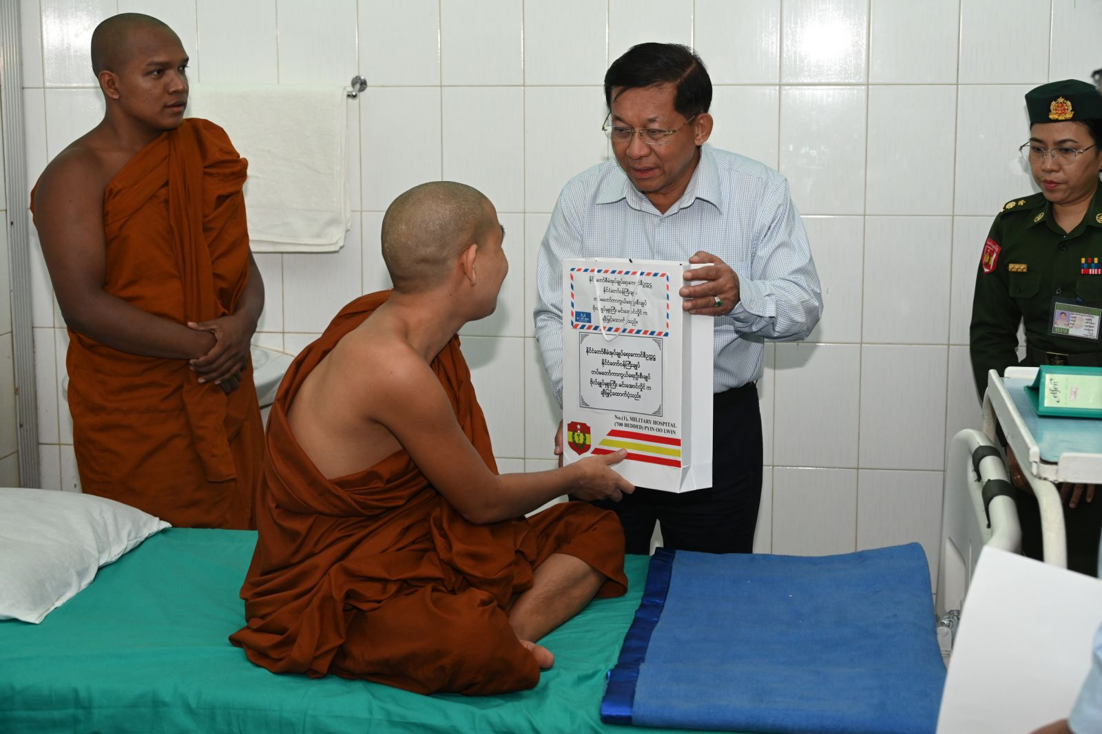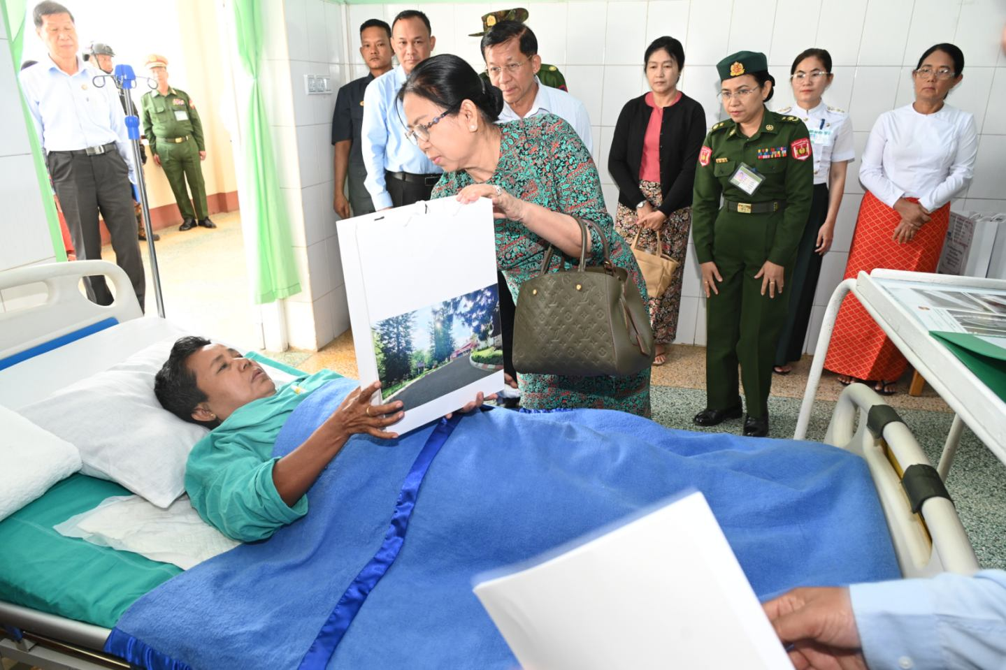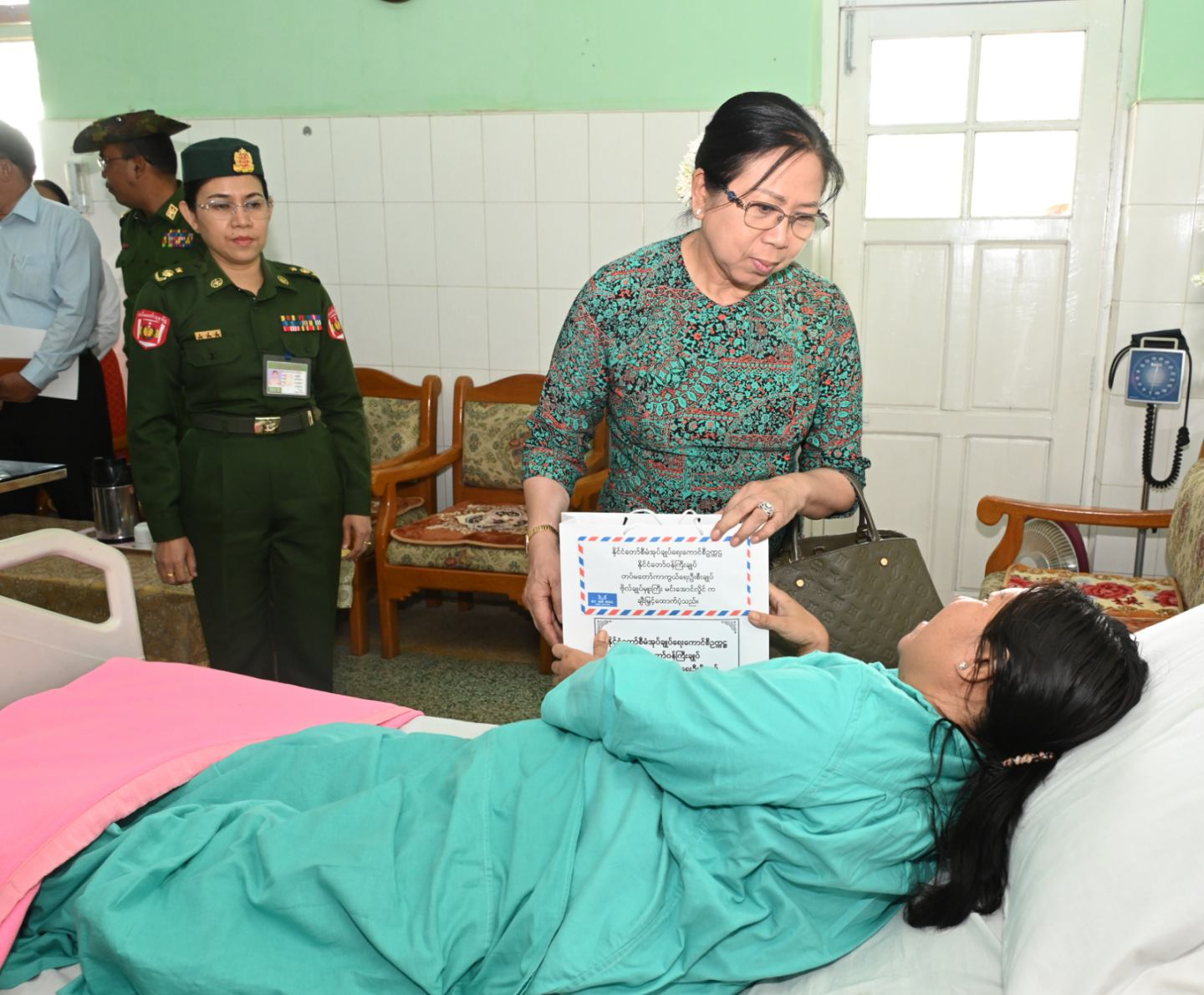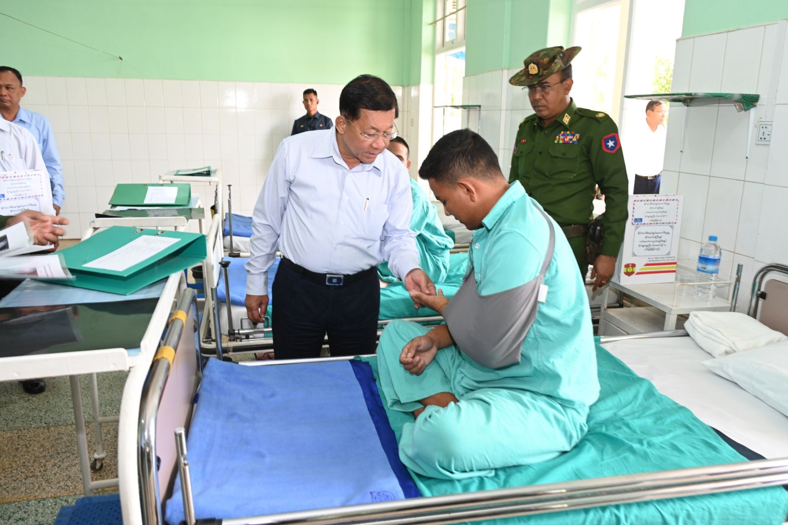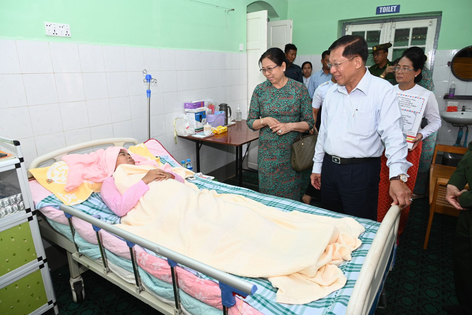 SAC Chairman Prime Minister Senior General Min Aung Hlaing, wife Daw Kyu Kyu Hla look into health conditions of earthquake-affected Tatmadaw members, families and police members at Tatmadaw hospital in PyinOoLwin
