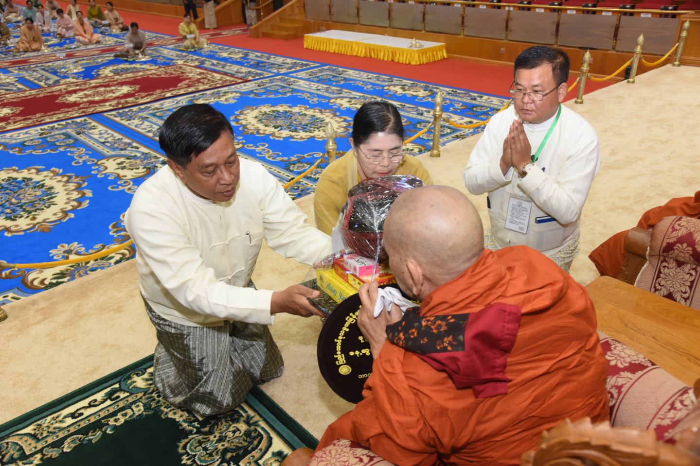 SAC Vice-Chairman DPM Vice-Senior General Soe Win, wife Daw Than Than Nwe offer alms and day meals to venerable members of the Sangha at Buddha Day ceremony