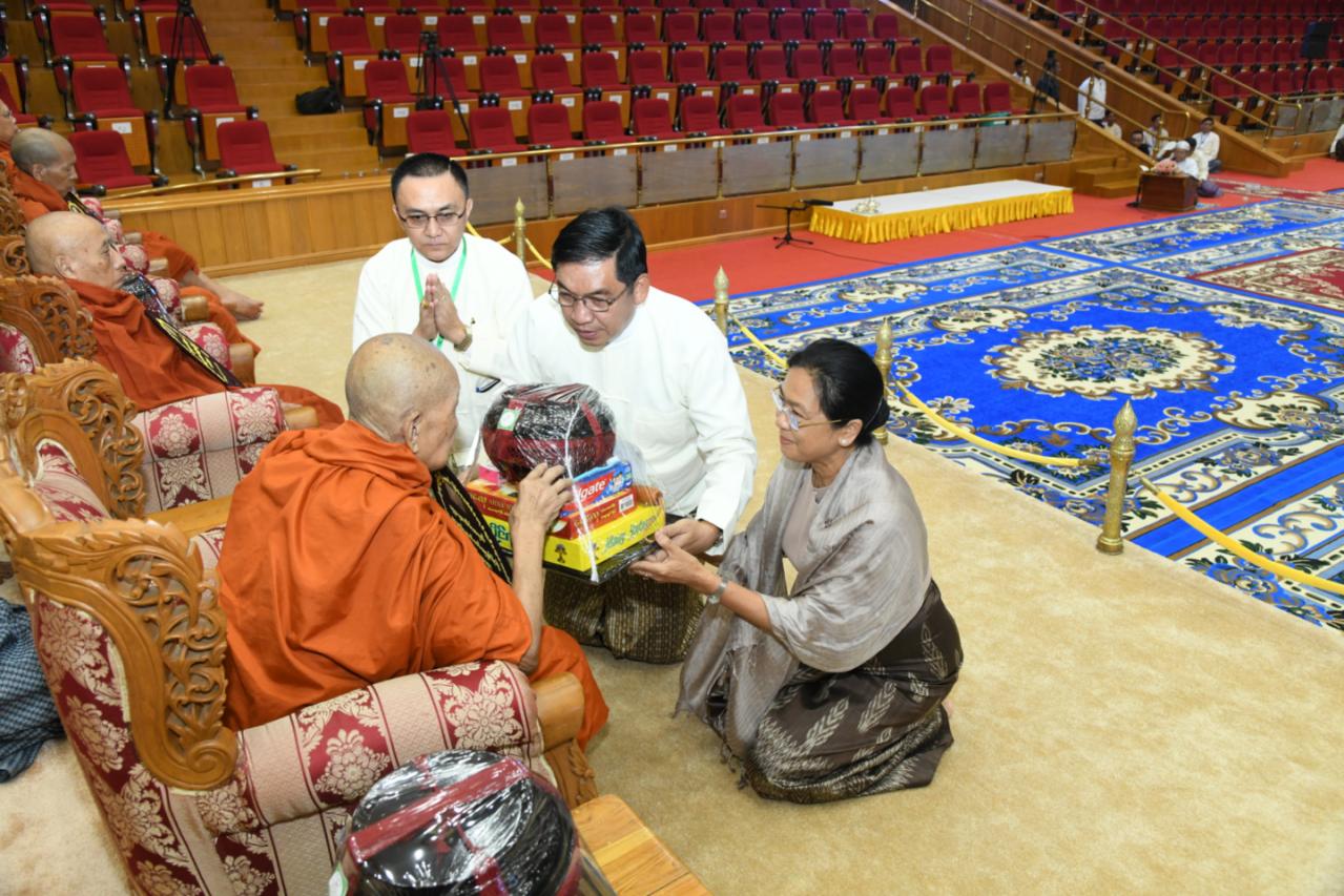 The ceremony was attended by Chairman of the State Sangha Maha Nayaka Committee Presiding Patron of Thanlyin’s Minkyaung Pahtamabyan Buddhism Learning Centre Aggamaha Pandita Aggamaha Saddhammajotikadhaja Dr Bhaddanta Candima Bhivamsa, Secretary of SSMNC Presiding Patron of New Masoeyein Monastery of Mahaaungmyay Township of Mandalay Abbot of Dhammathameikdi Monastery Aggamaha Pandita Aggamaha Saddhammajotikadhaja Maha Dhammakathika Bahujanahitadhara Bhaddanta Vasettha Bhivamsa and members of the Sangha, the Council Secretary and his wife, council members and their wives, Union-level dignitaries, Union ministers and their wives, the Nay Pyi Taw Council Chairman, senior Tatmadaw officers from the Office of the Commander-in-Chief and their wives, the commander of Nay Pyi Taw Command and officials.