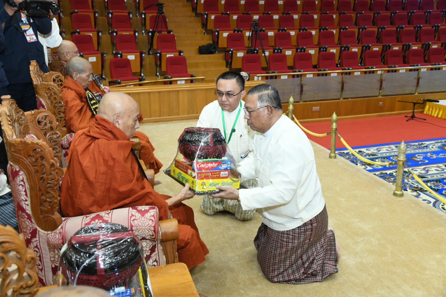 The Vice-Senior General and his wife offered offertories to the Chairman Sayadaw and the SAC Secretary and his wife to the Secretary Sayadaw while council members, and their wives and officials donated alms to members of the Sangha.