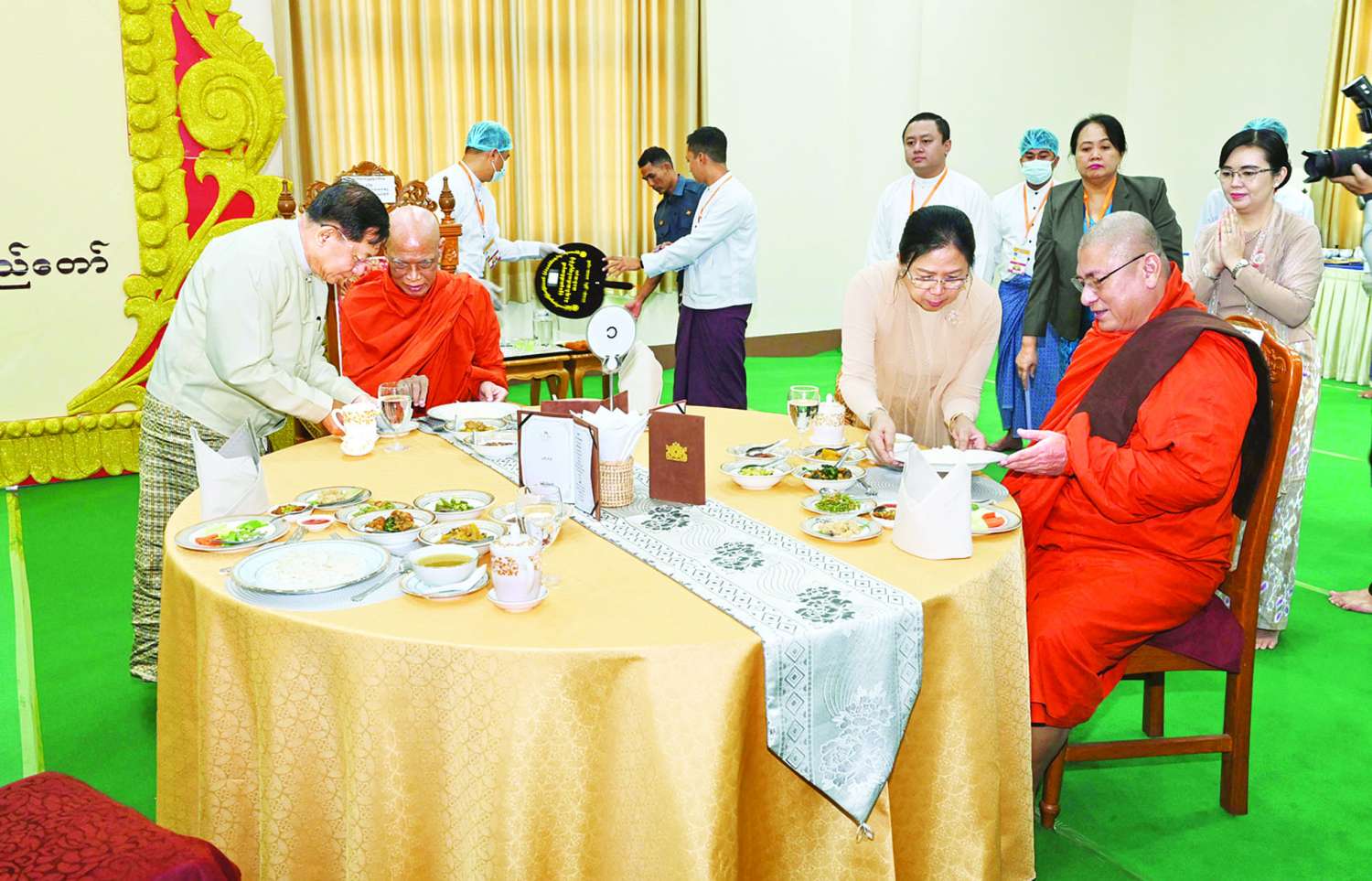 Chairman of the State Administration Council Prime Minister Senior General Min Aung Hlaing and his wife Daw Kyu Kyu Hla offered day meals to members of the Sangha who attended the ceremony of marking the Buddha Day on the Full Moon Day of Kason 2024 at Agga Dipati Sasana Beikman in the precinct of Maravijaya Buddha Park in Nay Pyi Taw yesterday morning.