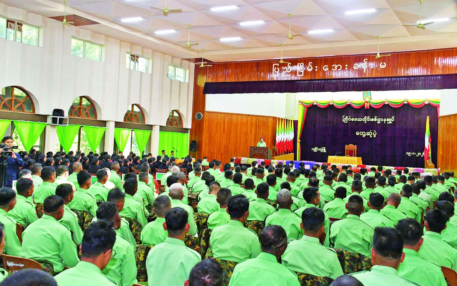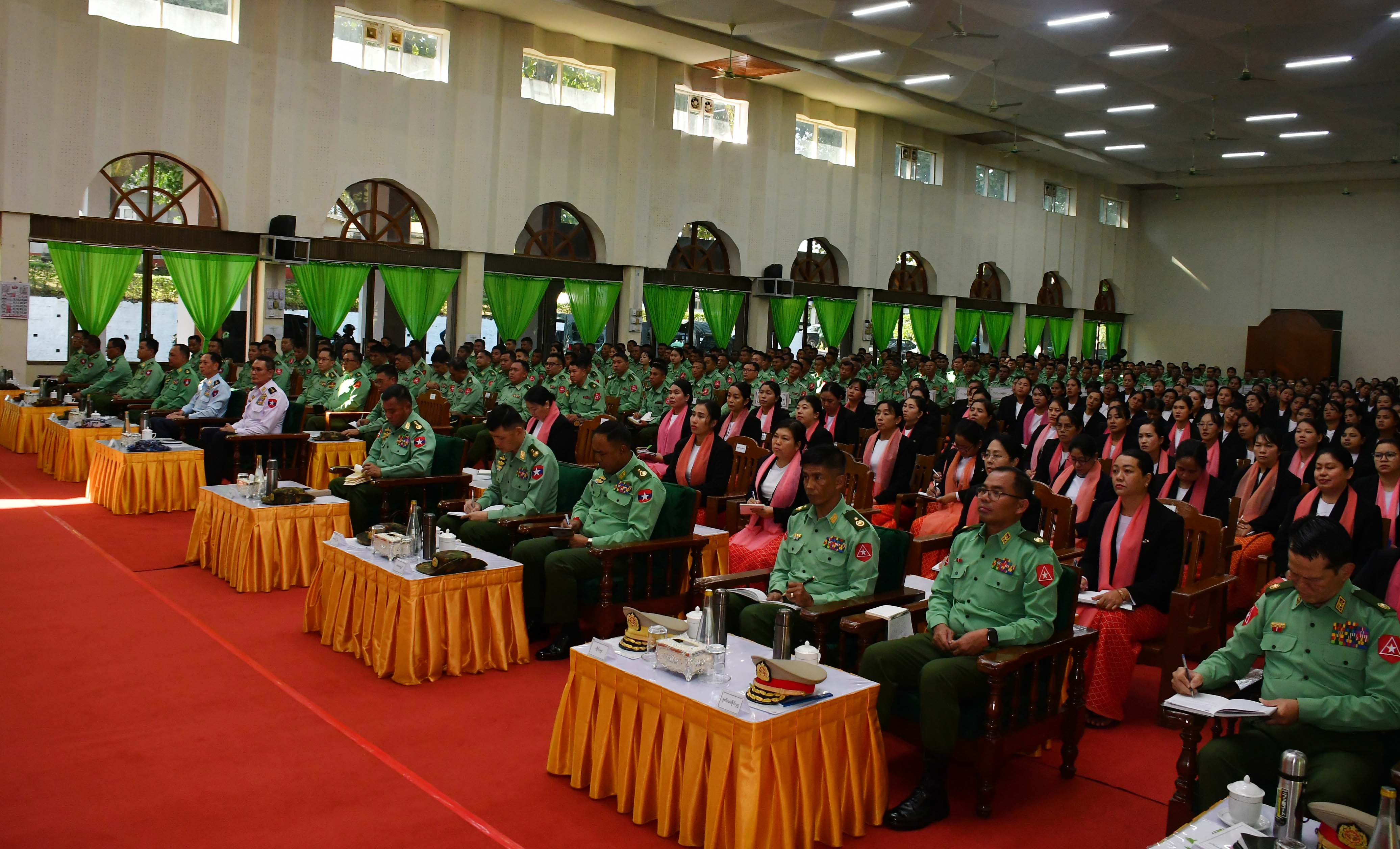 At the meeting hall of the command headquarters, Commander Maj-Gen Soe Hlaing reported on border region security, cooperation with neighbouring countries, combatting telecom fraud and online gambling, seizures of narcotic drugs, and anti-drug measures, efforts to reopen basic education schools, successful holding of Phases I and II of the general election, preparations for Phase III of the election, arrests of illegally foreign entrants, seizures of illegal commodities, military affairs, public healthcare services, undertakings of military-owned agriculture and livestock businesses, sales of meat, fish and eggs to Tatmadaw members and families as well as residents at fair prices.