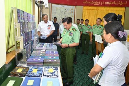 SAC Chairman Commander-in-Chief of Defence Services Senior General Min Aung Hlaing, his wife Daw Kyu Kyu Hla inspect peaceful learning of students at Shande BEHS No 5