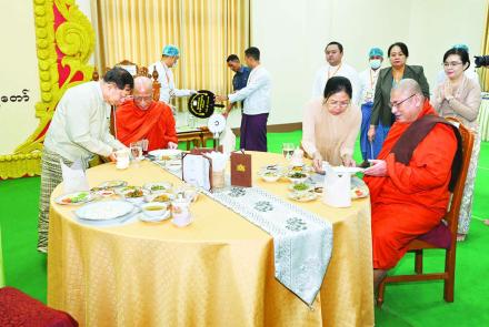 ကဆုန်လပြည့်ဗုဒ္ဓနေ့ဆင်ယင်ကျင်းပပူဇော်သည့်မဟာမင်္ဂလာအခမ်းအနားများသို့ကြွရောက်တော်မူကြသည့် ဆရာတော်ကြီးများအား နိုင်ငံတော်စီမံအုပ်ချုပ်ရေးကောင်စီဥက္ကဋ္ဌ နိုင်ငံတော်ဝန်ကြီးချုပ် ဗိုလ်ချုပ်မှူးကြီး မင်းအောင်လှိုင်နှင့်ဇနီးဒေါ်ကြူကြူလှတို့နေ့ဆွမ်းဆက်ကပ်လှူဒါန်း