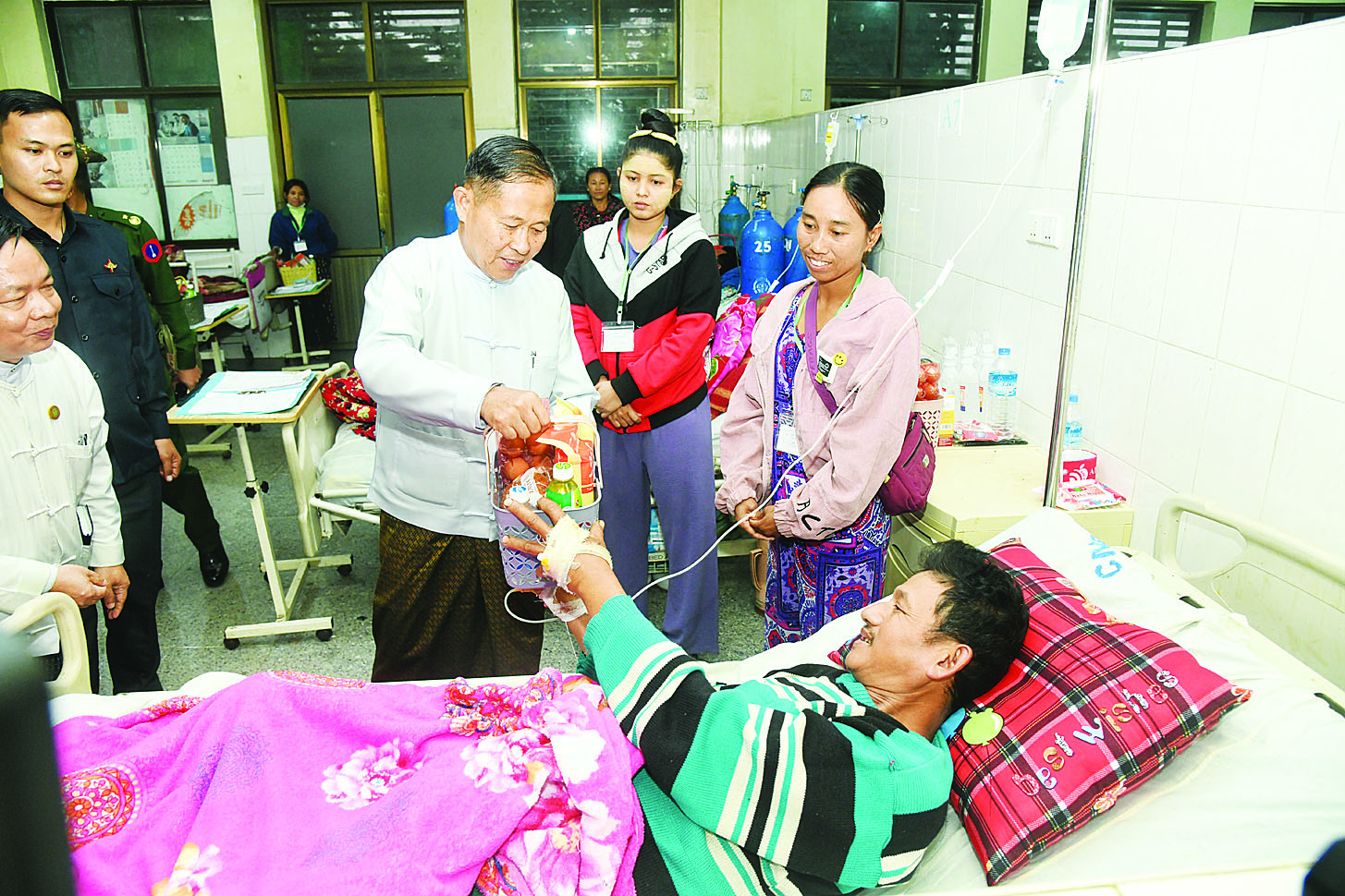 Vice-Senior General Soe Win also met university officials to review institutional needs, coordinated necessary measures, and presented awards to schools. He then visited Myitkyina Public Hospital to meet patients, assess medical conditions, encourage health workers, and present food and cash gifts. He also paid religious visits to Dhammarakkhita Wantho Monastery and the Kachin Baptist Church, where he met religious leaders, made offerings and donations, exchanged Christmas gifts, and conveyed greetings and thanks.