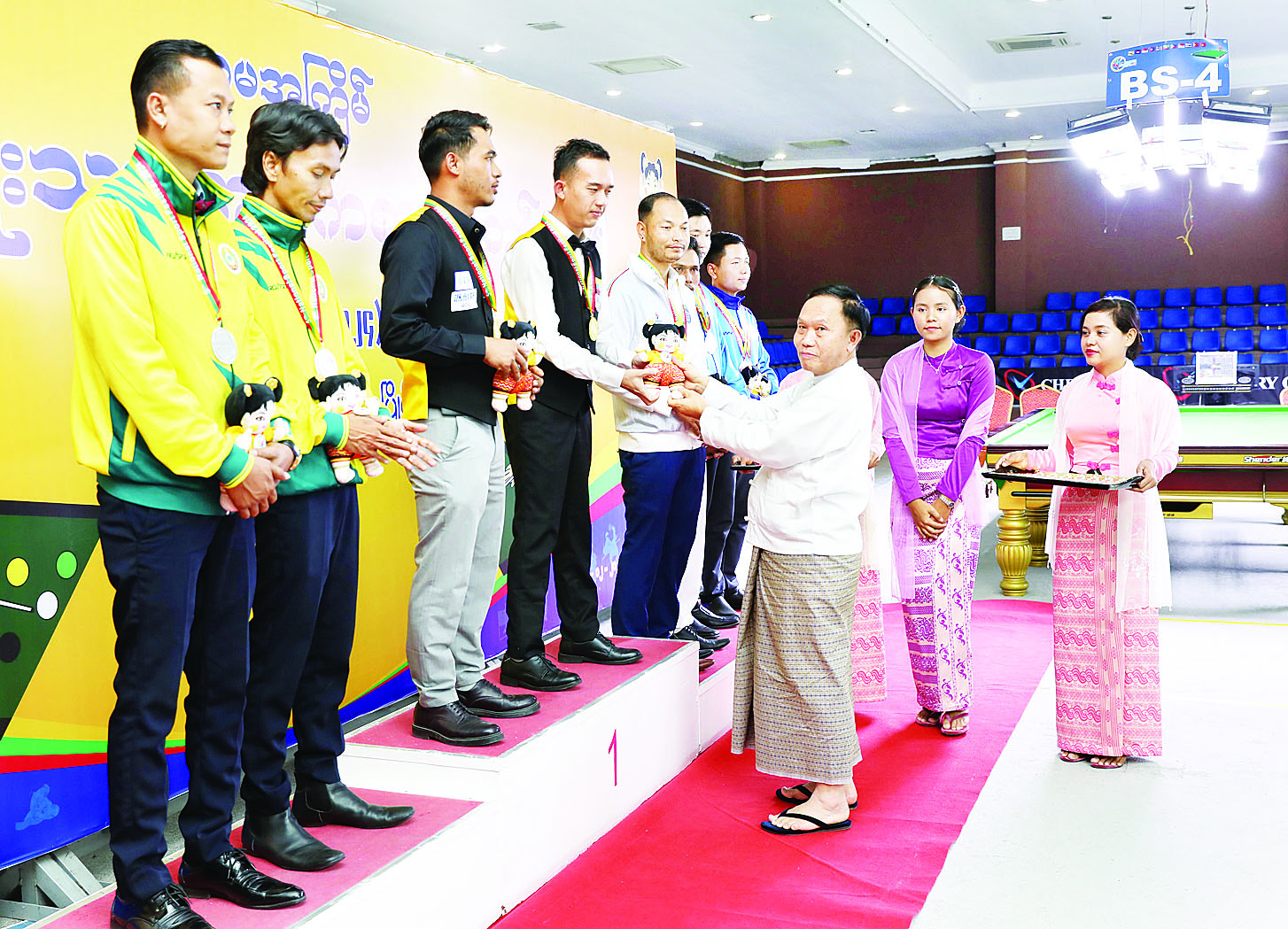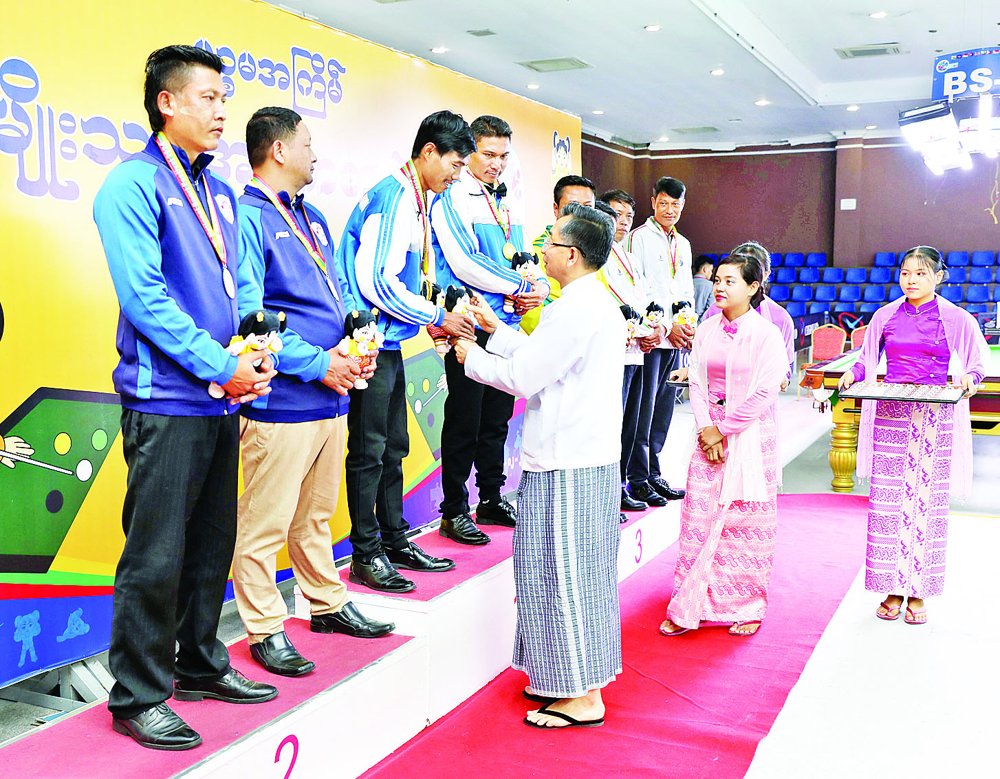 ပြည်နယ်နှင့်တိုင်းဒေသကြီးအဆင့် ဘိလိယက်နှင့်စနူကာပြိုင်ပွဲ ဆုချီးမြှင့်ပွဲအခမ်းအနားကို ဝဏ္ဏသိဒ္ဓိအားကစားကွင်း ဘိလိယက်ရုံ၌ကျင်းပရာ ဧရာဝတီတိုင်းဒေသကြီးအစိုးရ အဖွဲ့ လူမှုရေးရာဝန်ကြီး ဦးခင်မောင်ကြည်က Billiards Single ပြိုင်ပွဲတွင် ပထမဆုရရှိသည့် ဧရာဝတီတိုင်းဒေသကြီး၊ ဒုတိယဆုရရှိသည့် မကွေးတိုင်းဒေသကြီး၊ ပူးတွဲတတိယဆုရရှိကြသည့် ရန်ကုန်တိုင်းဒေသကြီးနှင့် ပြည်ထောင်စုနယ်မြေ နေပြည်တော်အသင်းတို့မှ ပြိုင်ပွဲဝင်များကိုလည်းကောင်း၊ ပြည်ထောင်စုဝန်ကြီး ဦးကိုကိုလွင်က Billiards Double ပြိုင်ပွဲတွင် ပထမဆုရရှိသည့် ဧရာဝတီတိုင်းဒေသကြီး၊ ဒုတိယဆုရရှိသည့် မန္တလေးတိုင်းဒေသကြီး၊ ပူးတွဲတတိယဆုရရှိသည့် ရန်ကုန်တိုင်းဒေသကြီးနှင့် ကချင်ပြည်နယ်အသင်းတို့မှ ပြိုင်ပွဲဝင်များကိုလည်းကောင်း တစ်ဦးချင်းဂုဏ်ပြုဆုတံဆိပ်နှင့် အမျိုးသားအားကစားပွဲတော်အထိမ်းအမှတ်အရုပ်များ ပေးအပ်ချီးမြှင့်ကြသည်။