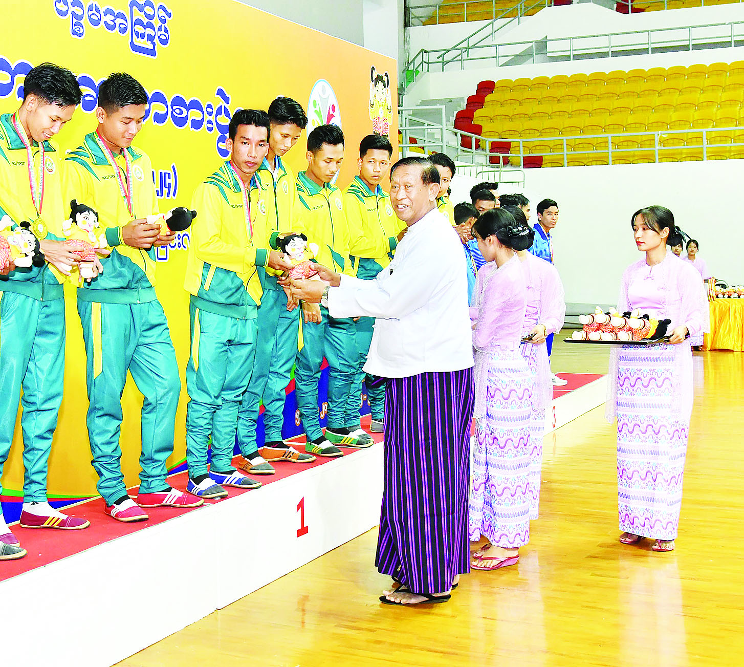 ထို့နောက် ဆုချီးမြှင့်ပွဲအခမ်းအနားကို ဆက်လက်ကျင်းပရာကောင်စီအဖွဲ့ဝင် ပိုးရယ်အောင်သိန်းက အမျိုးသားအသင်းလိုက်ပြိုင်ပွဲတွင် ပထမဆုရရှိသည့် ရန်ကုန်တိုင်းဒေသကြီး၊ ဒုတိယဆုရရှိသည့် မန္တလေးတိုင်းဒေသကြီးနှင့် တတိယဆုရရှိသည့် ပဲခူးတိုင်းဒေသကြီးအသင်းတို့မှ ပြိုင်ပွဲဝင်များကို လည်းကောင်း၊ ကောင်စီအဖွဲ့ဝင် ဒေါ်ဒွဲဘူက အမျိုးသမီးအသင်းလိုက်ပြိုင်ပွဲတွင် ပထမဆုရရှိသည့် မန္တလေးတိုင်းဒေသကြီး၊ ဒုတိယဆုရရှိသည့် ရန်ကုန်တိုင်းဒေသကြီးနှင့် တတိယဆုရရှိသည့် ပဲခူးတိုင်းဒေသကြီးအသင်းတို့မှ ပြိုင်ပွဲဝင်များကိုလည်းကောင်း တစ်ဦးချင်းဂုဏ်ပြုဆုတံဆိပ်နှင့် အမျိုးသားအားကစားပွဲတော်အထိမ်းအမှတ်အရုပ်များ ပေးအပ်ချီးမြှင့်ကြသည်။