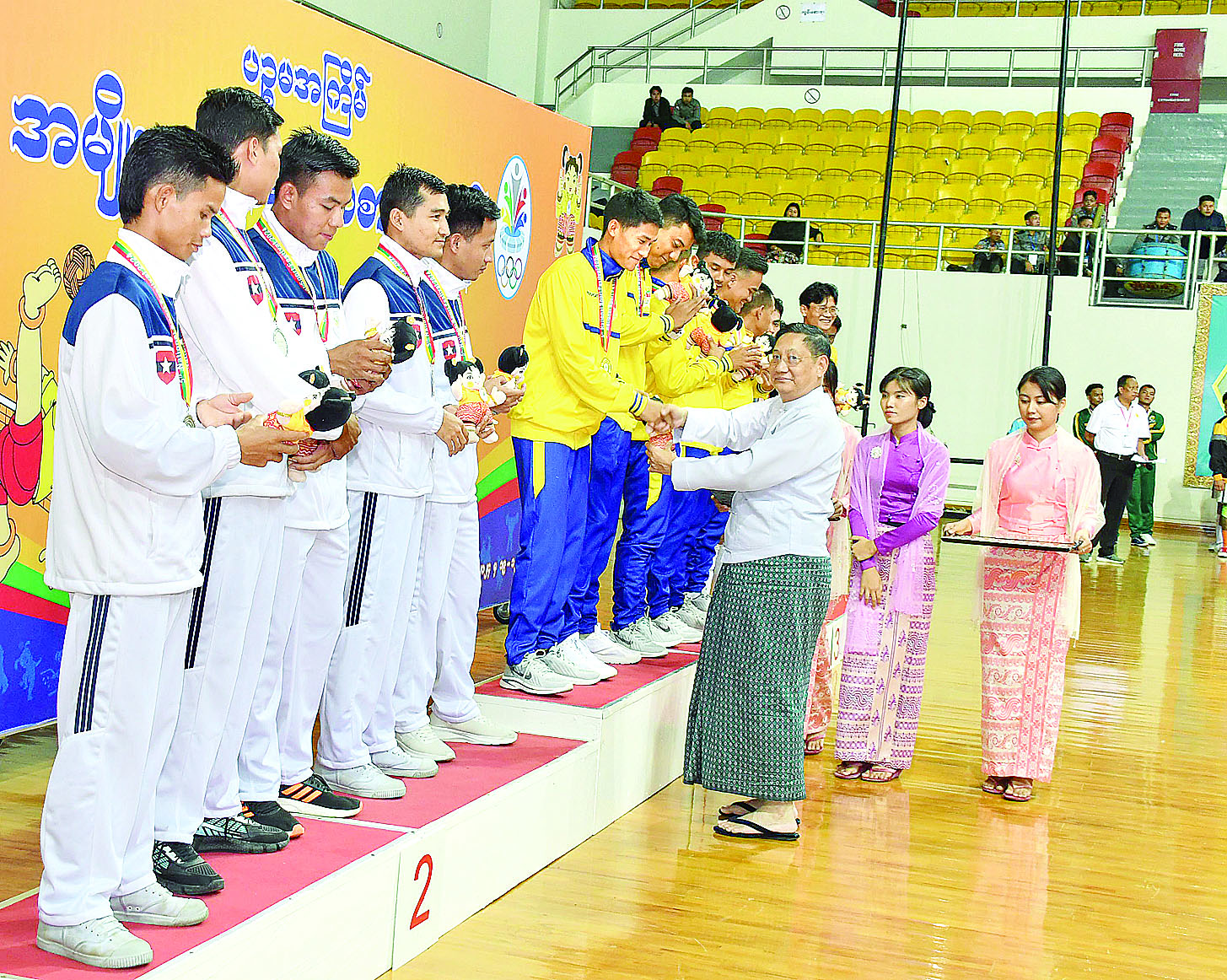 ယင်းနောက် ဆုချီးမြှင့်ပွဲအခမ်းအနားကို ဆက်လက်ကျင်းပရာ မွန်ပြည်နယ်အစိုးရအဖွဲ့ လူမှုရေးရာဝန်ကြီး ဦးစောကြည်နိုင်က အမျိုးသမီး (ကျန့်စု+ချန်းစု) ပြိုင်ပွဲတွင် ပထမဆုရရှိသည့် မန္တလေးတိုင်းဒေသကြီး၊ ဒုတိယဆုရရှိသည့် ရှမ်းပြည်နယ်နှင့် တတိယဆုရရှိသည့် မန္တလေးတိုင်းဒေသကြီးတို့မှ ပြိုင်ပွဲဝင်များကိုလည်းကောင်း၊ ပဲခူးတိုင်းဒေသကြီးအစိုးအရအဖွဲ့ လူမှုရေးရာဝန်ကြီး ဦးမျိုးအောင်က အမျိုးသား (နန်းသောင်း+ နန်းကွန့်) ပြိုင်ပွဲတွင် ပထမဆုရရှိသည့် ဧရာဝတီတိုင်းဒေသကြီး၊ ဒုတိယဆုရရှိသည့် ရန်ကုန်တိုင်းဒေသကြီးနှင့် တတိယဆုရရှိသည့် မကွေးတိုင်းဒေသကြီးအသင်းတို့မှ ပြိုင်ပွဲဝင်များကိုလည်းကောင်း၊ စစ်ကိုင်းတိုင်းဒေသကြီး အစိုးရအဖွဲ့ လူမှုရေးရာဝန်ကြီး ဦးညွန့်ဝင်းအောင်က အမျိုးသမီး (နန်းသောင်း+ နန်းကွန့်)ပြိုင်ပွဲတွင် ပထမဆုရရှိသည့် ရန်ကုန်တိုင်းဒေသကြီး၊ ဒုတိယဆုရရှိသည့် ကရင်ပြည်နယ်နှင့် တတိယဆုရရှိသည့် ချင်းပြည်နယ်အသင်းတို့မှ ပြိုင်ပွဲဝင်များကိုလည်းကောင်း၊ ချင်းပြည်နယ်အစိုးရအဖွဲ့ လမ်းပန်းဆက်သွယ်ရေးဝန်ကြီးဌာန ဦးနေလင်းအောင်က အမျိုးသား (သွှေ့လျန့်) ပြိုင်ပွဲတွင် ပထမဆုရရှိသည့် မကွေးတိုင်းဒေသကြီး၊ ဒုတိယဆုရရှိသည့် မွန်ပြည်နယ်နှင့် တတိယဆုရရှိသည့် မန္တလေးတိုင်းဒေသကြီးအသင်းတို့မှ ပြိုင်ပွဲဝင်များကိုလည်းကောင်း ဂုဏ်ပြုဆုတံဆိပ်နှင့် အမျိုးသားအားကစားပွဲတော်အထိမ်းအမှတ်အရုပ်များ ပေးအပ်ချီးမြှင့်ကြသည်။