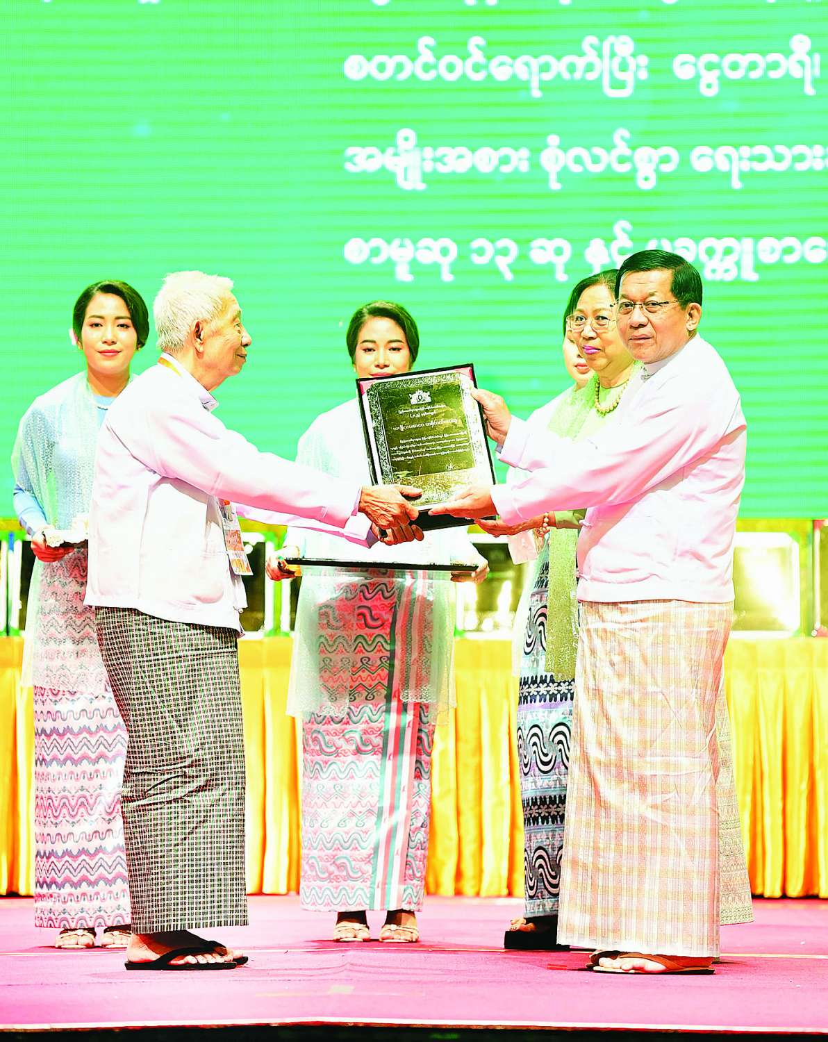 ဆက်လက်၍ နိုင်ငံတော်ယာယီသမ္မတ နိုင်ငံတော်လုံခြုံရေးနှင့်အေးချမ်းသာယာရေးကော်မရှင်ဥက္ကဋ္ဌနှင့်ဇနီးတို့က ၂၀၂၄ ခုနှစ် အမျိုးသားစာပေတစ်သက်တာဆုရရှိကြသည့် စာပေပညာရှင် ဆရာကြီးနှင့် ဆရာမကြီးများဖြစ်ကြသည့် ဦးသန်းညွန့် (ဇင်မင်း-သမိန်ထော)၊ ဦးကိုကို(ကို-တက္ကသိုလ်)၊ ဒေါက်တာ ဒေါ်ဝို (မလေးပို)၊ ဒေါ်တင်ရီ (တင်ရီမ -ညောင်ဦး)၊ ဒေါက်တာ ဒေါ်ခင်သန်း ဦး(မမိုးမြေ)တို့ကို နိုင်ငံတော်မှချီးမြှင့်သည့် ဂုဏ်ပြုမှတ်တမ်းလွှာ၊ ဂုဏ်ပြုချီးမြှင့်ငွေများနှင့် နိုင်ငံတော်ယာယီသမ္မတ နိုင်ငံတော်လုံခြုံရေးနှင့်အေးချမ်းသာယာရေးကော်မရှင်ဥက္ကဋ္ဌနှင့်ဇနီးတို့ကချီးမြှင့်သည့် အထူးဂုဏ်ပြုလက်ဆောင်များကို ပေးအပ်ချီးမြှင့်သည်။