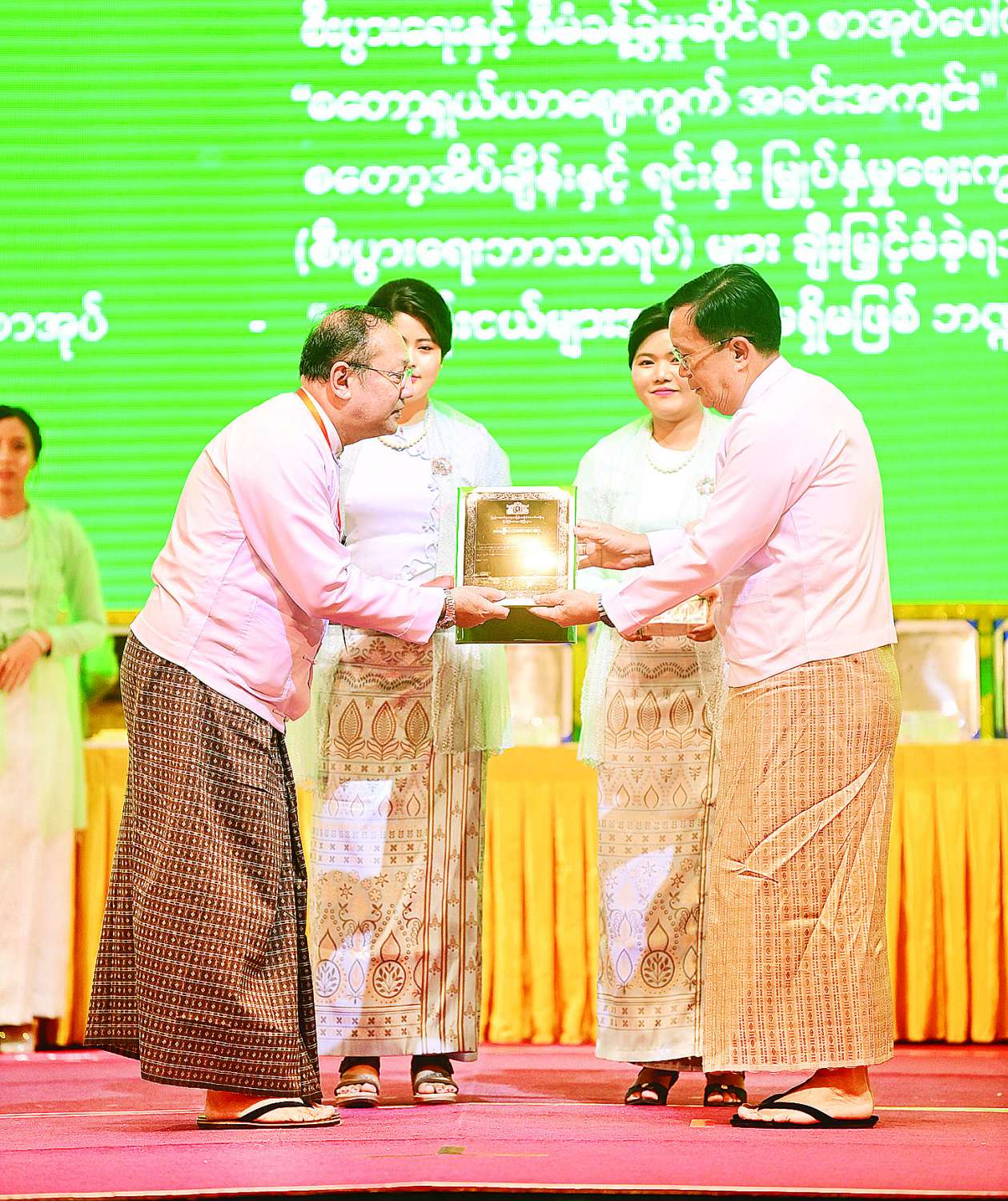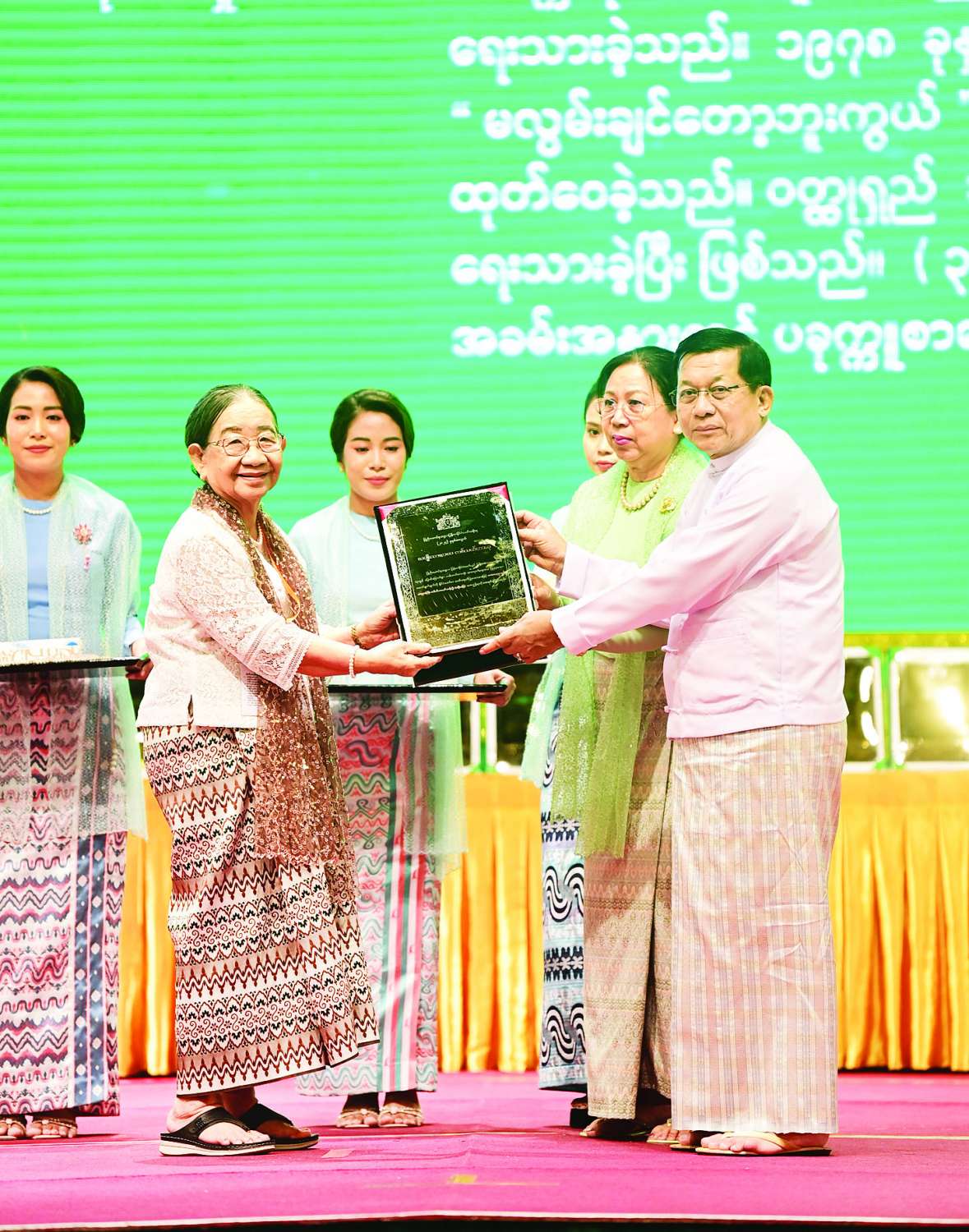 ယင်းနောက် နိုင်ငံတော်ယာယီသမ္မတ နိုင်ငံတော်လုံခြုံရေးနှင့်အေးချမ်းသာယာရေးကော်မရှင်ဥက္ကဌနှင့်ဇနီးတို့အား ပြန်ကြားရေးဝန်ကြီးဌာန ပြည်ထောင်စုဝန်ကြီး ဦးမောင်မောင်အုန်းက ၂ဝ၂၄ ခုနှစ်အတွက် အမျိုးသားစာပေတစ်သက်တာဆု၊ အမျိုးသားစာပေဆုနှင့် စာပေဗိမာန်စာမူဆု ဆုနှင်းသဘင်အခမ်းအနား အထိမ်းအမှတ်ဂုဏ်ပြုလက်ဆောင်အား ဂါရဝပြုပေးအပ်သည်။