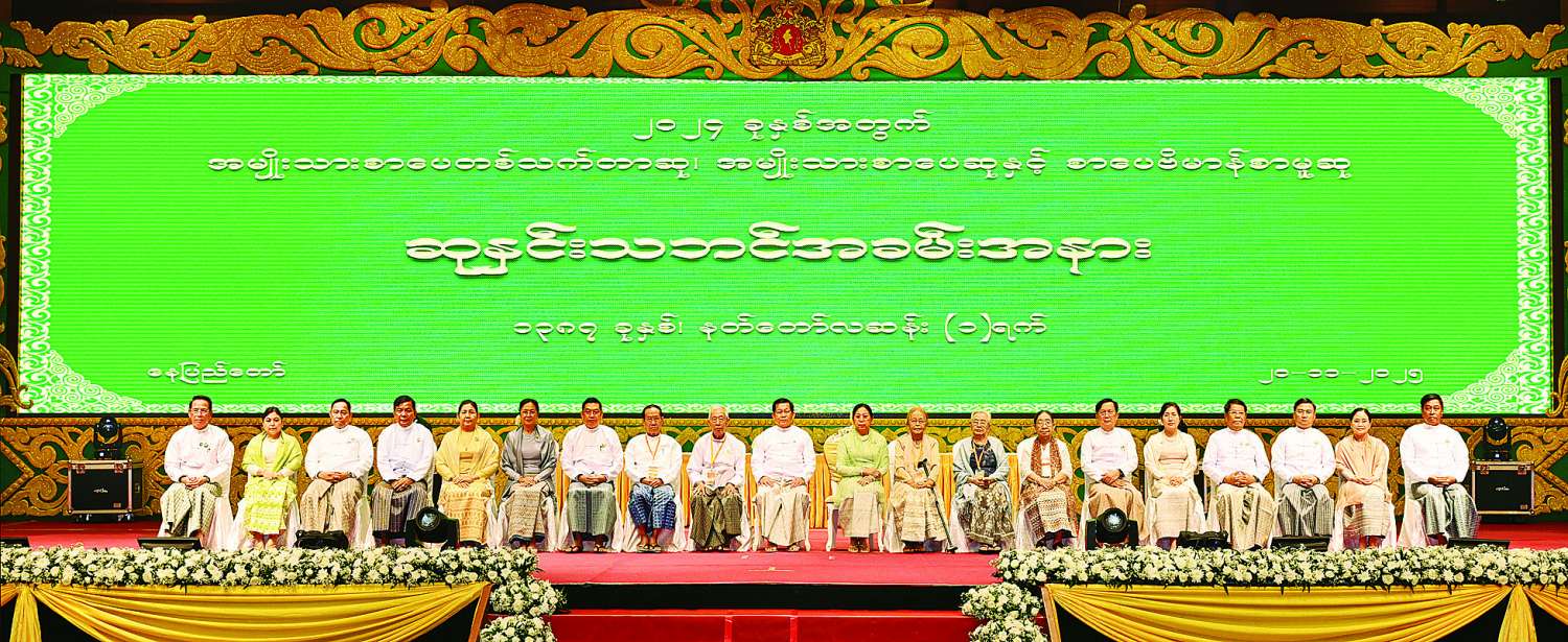 ၂၀၂၄ ခုနှစ်အတွက် အမျိုးသားစာပေတစ်သက်တာဆု၊ အမျိုးသားစာပေဆုနှင့် စာပေဗိမာန်စာမူဆု ဆုနှင်းသဘင်အခမ်းအနားကျင်းပ ပြည်ထောင်စုသမ္မတမြန်မာနိုင်ငံတော်ယာယီသမ္မတ နိုင်ငံတော်လုံခြုံရေးနှင့်အေးချမ်းသာယာရေးကော်မရှင်ဥက္ကဋ္ဌ ဗိုလ်ချုပ်မှူးကြီး မင်းအောင်လှိုင်နှင့်ဇနီး ဒေါ်ကြူကြူလှ တက်ရောက်ချီးမြှင့်ပေးအပ်