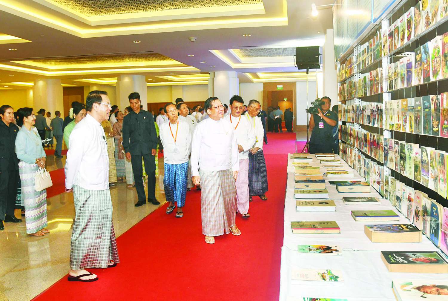 ဦးစွာ နိုင်ငံတော်ယာယီသမ္မတ နိုင်ငံတော်လုံခြုံရေးနှင့်အေးချမ်းသာယာရေးကော်မရှင်ဥက္ကဋ္ဌနှင့် ဇနီး၊ အခမ်းအနားတက်ရောက်လာကြသူများသည် ၂၀၂၄ ခုနှစ်အတွက် အမျိုးသားစာပေတစ်သက်တာဆု၊ အမျိုးသားစာပေဆုနှင့် စာပေဗိမာန်စာမူဆုရရှိကြသူများ၏ အတ္ထုပ္ပတ္တိ၊ ဓာတ်ပုံ၊ ဆုရစာအုပ်များ၊ စာအုပ်စာစောင်နှင့် စာပေဆိုင်ရာပြခန်းများကို လှည့်လည်ကြည့်ရှုကြသည်။