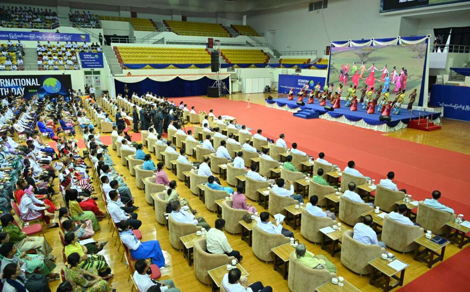 ၂၀၂၄ ခုနှစ်၊ အပြည်ပြည်ဆိုင်ရာ လူငယ်များနေ့အခမ်းအနားကို ယနေ့မွန်းလွဲပိုင်းတွင် နေပြည်တော်ရှိ ဝဏ္ဏသိဒ္ဓိအားကစားရုံ(C)၌ ကျင်းပပြုလုပ်ရာ နိုင်ငံတော်စီမံအုပ်ချုပ်ရေးကောင်စီဥက္ကဋ္ဌ နိုင်ငံတော်ဝန်ကြီးချုပ် ဗိုလ်ချုပ်မှူးကြီး မင်အောင်လှိုင် တက်ရောက်အမှာစကားပြောကြားသည်။