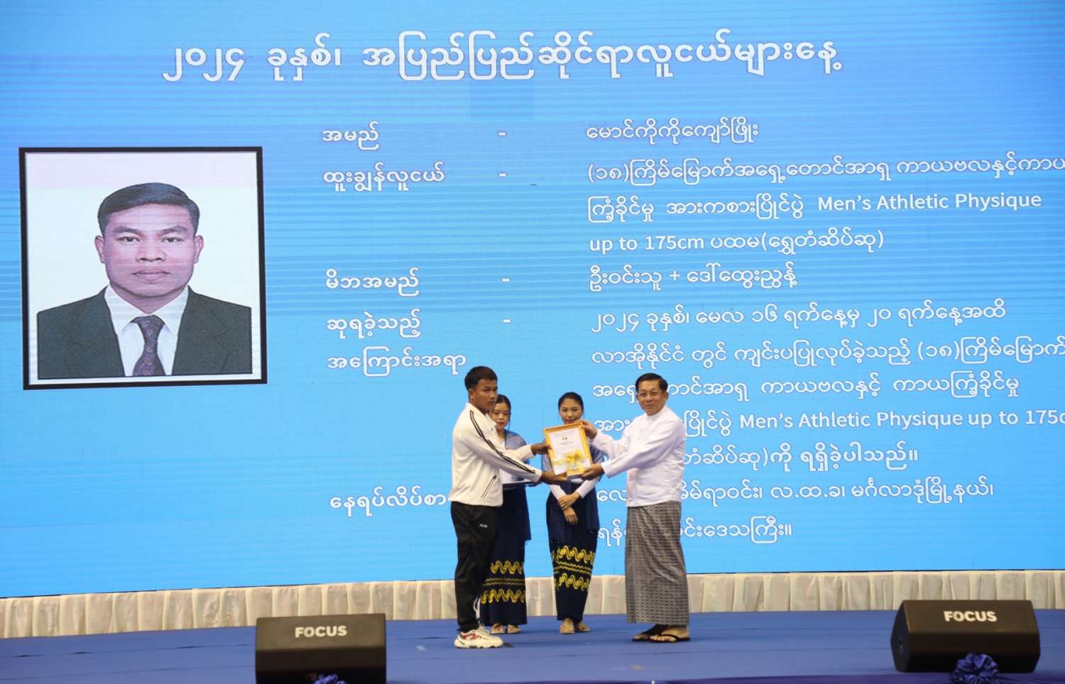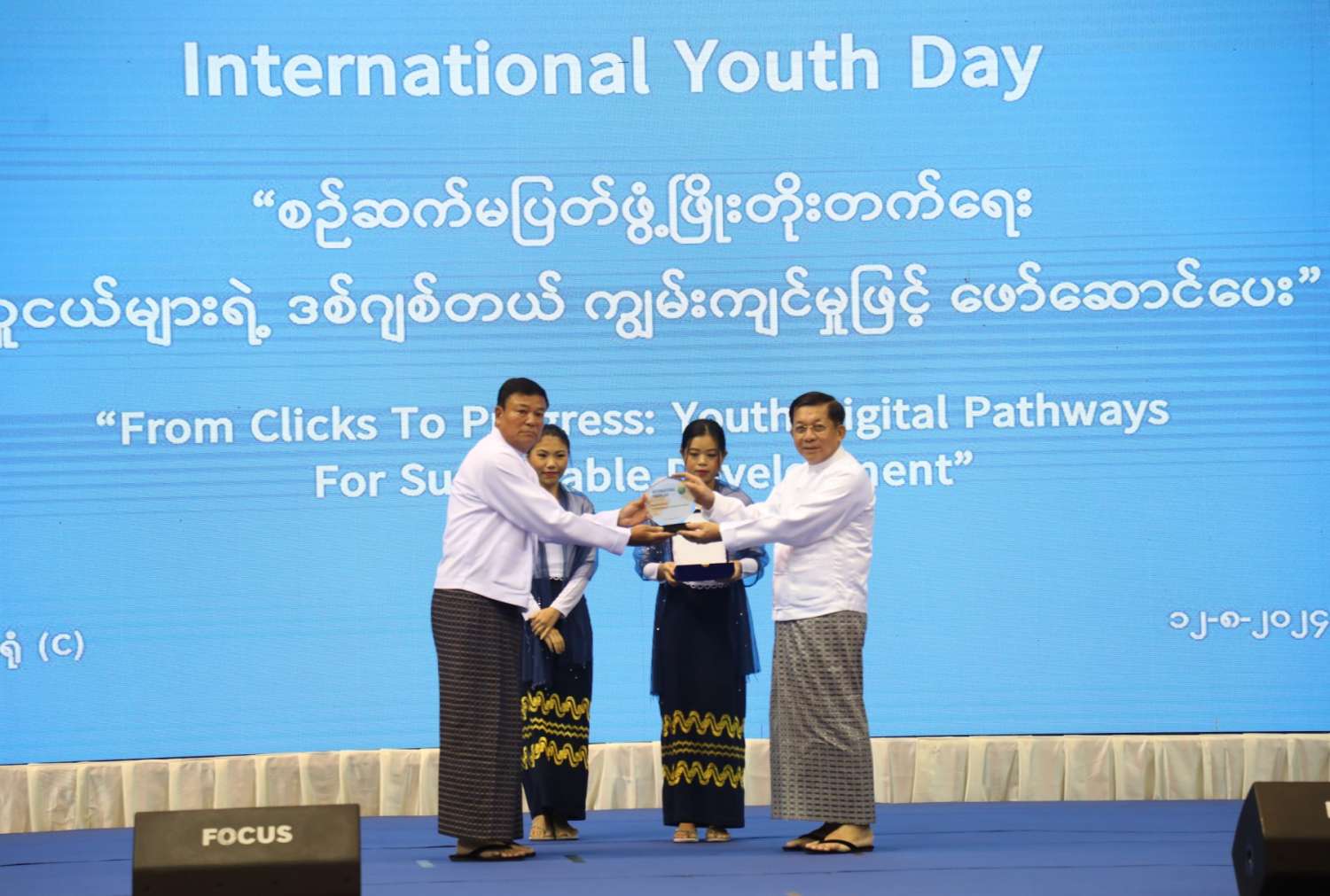 ယင်းနောက် နိုင်ငံတော်စီမံအုပ်ချုပ်ရေးကောင်စီဥက္ကဋ္ဌ နိုင်ငံတော်ဝန်ကြီးချုပ်က အပြည်ပြည်ဆိုင်ရာပြိုင်ပွဲများတွင် ရွှေတံဆိပ်ဆုရ ထူးချွန်လူငယ်များအား ဂုဏ်ပြုဆုများ ပေးအပ်ချီးမြှင့်သည်။ ထို့နောက် မြန်မာနိုင်ငံလူငယ်ရေးရာဗဟိုကော်မတီဥက္ကဋ္ဌ၊ အားကစားနှင့် လူငယ်ရေးရာဝန်ကြီးဌာန ပြည်ထောင်စုဝန်ကြီး ဦးမင်းသိန်းဇံက နိုင်ငံတော်စီမံအုပ်ချုပ်ရေးကောင်စီဥက္ကဋ္ဌ နိုင်ငံတော်ဝန်ကြီးချုပ်ထံ အပြည်ပြည်ဆိုင်ရာ လူငယ်များနေ့ အထိမ်းအမှတ်လက်ဆောင်အား ဂါရဝပြုပေးအပ်သည်။