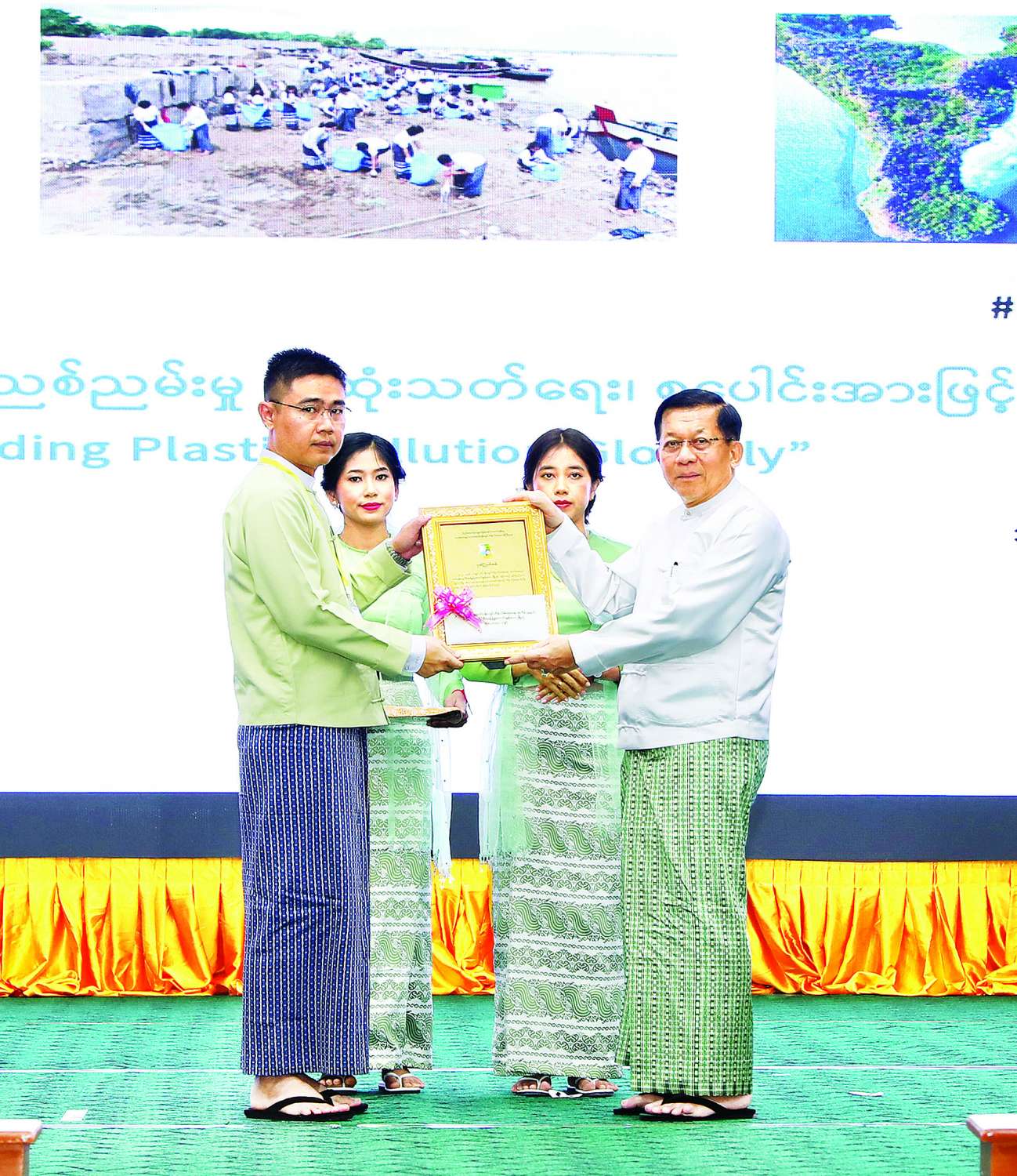 ထို့နောက် နိုင်ငံတော်စီမံအုပ်ချုပ်ရေးကောင်စီဥက္ကဋ္ဌ နိုင်ငံတော်ဝန်ကြီးချုပ်က ပတ်ဝန်းကျင် စီမံခန့်ခွဲမှုကောင်းမွန်သောမြို့ ဆုရရှိသည့် ရှမ်းပြည်နယ်(အရှေ့ပိုင်း)၊ ကျိုင်းတုံမြို့မှ တာဝန်ရှိသူထံလည်းကောင်း၊ ပတ်ဝန်းကျင်စီမံခန့်ခွဲမှု ကောင်းမွန်သော ကျေးရွာဆုရရှိသည့် မန္တလေးတိုင်းဒေသကြီး၊ ညောင်ဦးမြို့နယ်၊ မြင်းကပါကျေးရွာမှ တာဝန်ရှိသူထံလည်းကောင်း၊ ပတ်ဝန်းကျင်စီမံခန့်ခွဲမှု ကောင်းမွန်သော စက်ရုံဆုရရှိသည့် မန္တလေးတိုင်းဒေသကြီး၊ သာစည်မြို့နယ်ရှိ Great Success Energy Co.Ltd (၃၀ မဂ္ဂဝပ် နေရောင်ခြည်စွမ်းအင်သုံး လျှပ်စစ်ဓာတ်အား ထုတ်လုပ်ခြင်းလုပ်ငန်း)မှ တာဝန်ရှိသူထံလည်းကောင်း ဆုများပေးအပ်ချီးမြှင့်သည်။