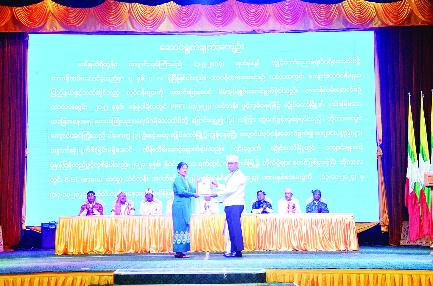 ဆက်လက်၍ (၇၃) နှစ်မြောက် ကယားပြည်နယ်နေ့အထိမ်းအမှတ် ဂုဏ်ထူးဆောင်လက်မှတ်နှင့် ဂုဏ်ထူးဆောင်ဆုရရှိသူများ၊ ပဉ္စမအကြိမ် အမျိုးသားအားကစားပြိုင်ပွဲနှင့် (၂၅) ကြိမ်မြောက် အဆို၊ အက၊ အရေး၊ အတီး ပြိုင်ပွဲတွင် ဆုရရှိသူများအား ဒုတိယဝန်ကြီးချုပ်နှင့် ပြည်ထောင်စုဝန်ကြီးနှင့် နိုင်ငံတော်စီမံအုပ်ချုပ်ရေးကောင်စီအဖွဲ့ဝင်များ၊ ပြည်ထောင်စုဝန်ကြီးများ၊ ပြည်နယ်ဝန်ကြီးချုပ်နှင့် ဒေသကွပ်ကဲရေးမှူးတို့က ဂုဏ်ပြုဆုများ ချီးမြှင့်ပေးအပ်သည်။