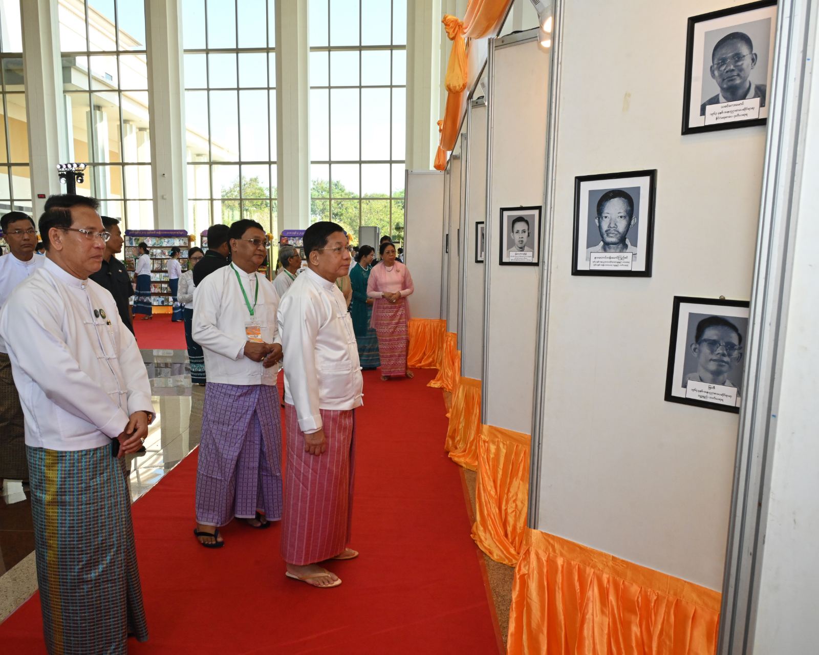 ယင်းနောက်နိုင်ငံတော်စီမံအုပ်ချုပ်ရေးကောင်စီဥက္ကဋ္ဌ နိုင်ငံတော်ဝန်ကြီးချုပ်နှင့် ဇနီး၊ အခမ်းအနား တက်ရောက်လာကြသူများသည် စိန်ရတုအမျိုးသားစာပေဆု အထိမ်းအမှတ်ပြခန်း ၂၀၂၃ ခုနှစ်အတွက် ဆုရရှိသူများ၏ အတ္ထုပတ္တိ၊ ဓာတ်ပုံ၊ ဆုရစာအုပ်များ၊ စာအုပ်စာစောင်များနှင့် အင်းဝခေတ် မြန်မာစာပေဖွံ့ဖြိုးတိုးတက်မှု ပြခန်း၊ စာပေဆိုင်ရာ ပြခန်းများကို လှည့်လည်ကြည့်ရှုကြသည်။