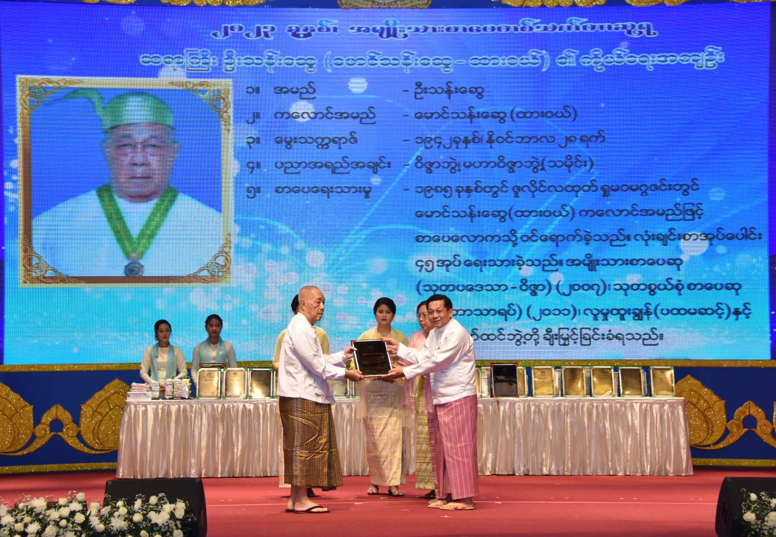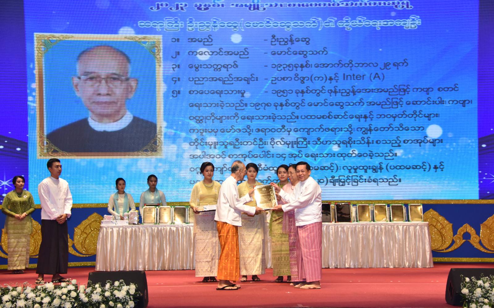 အမျိုးသားစာပေတစ်သက်တာဆုကို ချီးမြှင့်ရာတွင်လည်း စာပေပညာရှင်ကြီးများကို အလေးအမြတ်ထားသည့်အနေဖြင့် တစ်နှစ်ထက်တစ်နှစ် အရေအတွက်တိုးပြီး ချီးမြှင့်ရန်ဆောင်ရွက်ခဲ့ကြောင်း၊ စတင်ခဲ့သည့် ၂၀၀၁ ခုနှစ်မှ ၂၀၁၁ ခုနှစ်အထိ တစ်နှစ်လျှင်(၁)ဦးသာ ချီးမြှင့်ပြီးနောက်ပိုင်းတွင် တစ်နှစ်ကို (၂) ဦး၊ (၃) ဦး ရွေးချယ်ချီးမြှင့်ခဲ့ကြောင်း၊ မိမိတို့တာဝန်ယူခဲ့သည့် ကာလတွင် တစ်နှစ်လျှင် (၄) ဦး အထိ ဂုဏ်ပြုချီးမြှင့်ခဲ့ကြောင်း၊ ယခုနှစ်တွင်လည်း စာပေပညာရှင်ကြီး (၆) ဦးအထိ ဂုဏ်ပြုချီးမြှင့်သွားမည်ဖြစ်ကြောင်း၊ စာပေပညာရှင်ကြီးများအားလုံးကို အမျိုးသားစာပေတစ်သက်တာဆုရှင်များအဖြစ် နိုင်ငံတော်က ထိုက်တန်စွာ ချီးမြှောက်ခွင့်ရသည့်အတွက် အတိုင်းမသိ ဂုဏ်ယူဝမ်းမြောက်မိပါကြောင်း။