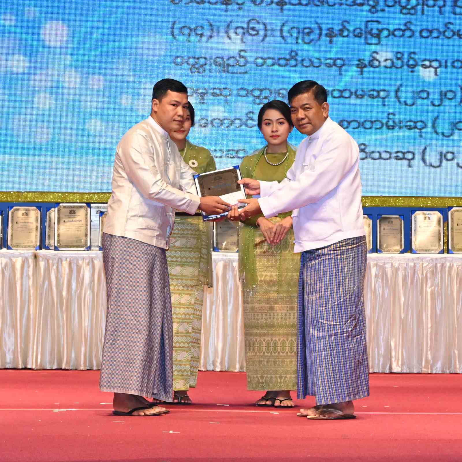 (၇၅) ကြိမ်မြောက် စိန်ရတုအမျိုးသားစာပေဆုအထိမ်းအမှတ် ၂ဝ၂၃ ခုနှစ်အတွက် အမျိုးသားစာပေတစ်သက်တာဆု၊ အမျိုးသားစာပေဆုနှင့် စာပေဗိမာန်စာမူဆု ဆုနှင်းသဘင်အခမ်းအနားကျင်းပ နိုင်ငံတော်စီမံအုပ်ချုပ်ရေးကောင်စီဥက္ကဋ္ဌ နိုင်ငံတော်ဝန်ကြီးချုပ် ဗိုလ်ချုပ်မှူးကြီး မင်းအောင်လှိုင်နှင့် ဇနီး ဒေါ်ကြူကြူလှ တက်ရောက်ချီးမြှင့်ပေးအပ်