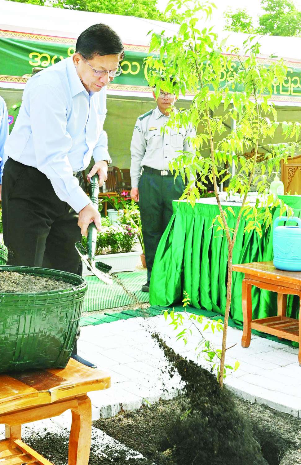 ယနေ့တွင် အပူပိုင်းဒေသ ၁၃ ခရိုင်၌ ပျိုးပင်ပေါင်း ၃၄၉၅ဝ ပင်အား စိုက်ပျိုးသွားမည်ဖြစ်ကြောင်း၊ ယခုနေရာများသည် ယခင်တည်းက စိုက်ပျိုးခဲ့သည့် နေရာများဖြစ်ကြောင်း၊ သို့သော်ရှင်သန်မှုများ အားနည်းခြင်း၊ ဒေသလိုအပ်ချက်အရ သစ်ပင်များ တရားမဝင်ခုတ်ထွင်ခြင်းများကြောင့် ထိုက်သင့်သလောက် အကျိုးမရရှိခဲ့ကြောင်း၊ ယခုကဲ့သို့ သစ်ပင်စိုက်ပျိုးပွဲများ ကျင်းပခြင်းကြောင့် အချိန်၊ လူအင်အားနှင့် ငွေကြေးကုန်ကျမှုများရှိကြောင်း၊ ထို့ကြောင့် မိမိတို့စိုက်ပျိုးသည့် အပင်များ စနစ်တကျစိုက်ပျိုးထိန်းသိမ်းသွားကြရန် “တစ်ပင်စိုက်၊ တစ်ပင်ရှင်” ဖြစ်အောင်လိုကြောင်း၊ မိမိတို့စိုက်ပျိုးသည့် အပင်များအားလုံးရှင်သန်စေရန်အတွက် တာဝန်ရှိသူများက စနစ်တကျဆက်လက်ထိန်းသိမ်းခြင်းလုပ်ငန်းများကို စေတနာထား၍ ဆောင်ရွက်သွားကြရန်လိုကြောင်း။ မိမိတို့နိုင်ငံတွင် သစ်တောဖုံးလွှမ်းမှုများ ကျဆင်းလာကြောင်း၊ ယခုအခါ ၄၂ ဒသမ ၁၉ ရာခိုင်နှုန်းခန့်သာ ကျန်ရှိတော့ကြောင်း၊ တစ်နိုင်ငံလုံးသစ်တောဖုံးလွှမ်းမှု ဧရိယာ ၅၀ ရာခိုင်နှုန်းပြန်လည်ရရှိစေရေး သစ်ပင်စိုက်ပျိုးများကို ကျင်းပပြုလုပ်၍ ကြိုးပမ်းဆောင်ရွက်လျက်ရှိကြောင်း၊ အဆိုပါသစ်ပင်စိုက်ပျိုးခြင်း၏ အကျိုးကျေးဇူးများကို လက်ငင်းခံစား၍မရနိုင်သော်လည်း နောင် ၇ နှစ် ၈ နှစ်ခန့်တွင် ခံစားရမည်ဖြစ်ကြောင်း၊ မိမိတို့အနေဖြင့်လည်း ယခင်က စိုက်ပျိုးထိန်းသိမ်းခဲ့မှုများကြောင့် သစ်ကြီးဝါးကြီးများ၏ အရိပ်အာဝါသကို ခံစားရခြင်းဖြစ်ကြောင်း၊ မိမိတို့၏ လာမည့်သားစဉ်မြေးဆက်ကိုလည်း ထိုသို့ ခံစားရစေလိုသည့်စိတ်ဖြင့် ဆောင်ရွက်သွားကြရန်လိုကြောင်း။