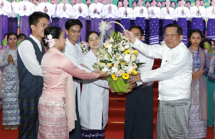 နိုင်ငံတော်စီမံအုပ်ချုပ်ရေးကောင်စီဥက္ကဋ္ဌ တပ်မတော်ကာကွယ်ရေးဦးစီးချုပ် ဗိုလ်ချုပ်မှူးကြီး သတိုးမဟာသရေစည်သူ သတိုးသီရိသုဓမ္မ မင်းအောင်လှိုင် ဘွဲ့ရအမျိုးသမီးဗိုလ်လောင်းသင်တန်းအမှတ်စဉ်(၁၁) သင်တန်းဆင်း ဂုဏ်ပြုစစ်ရေးပြအခမ်းအနားသို့ တက်ရောက်မိန့်ခွန်းပြောကြား