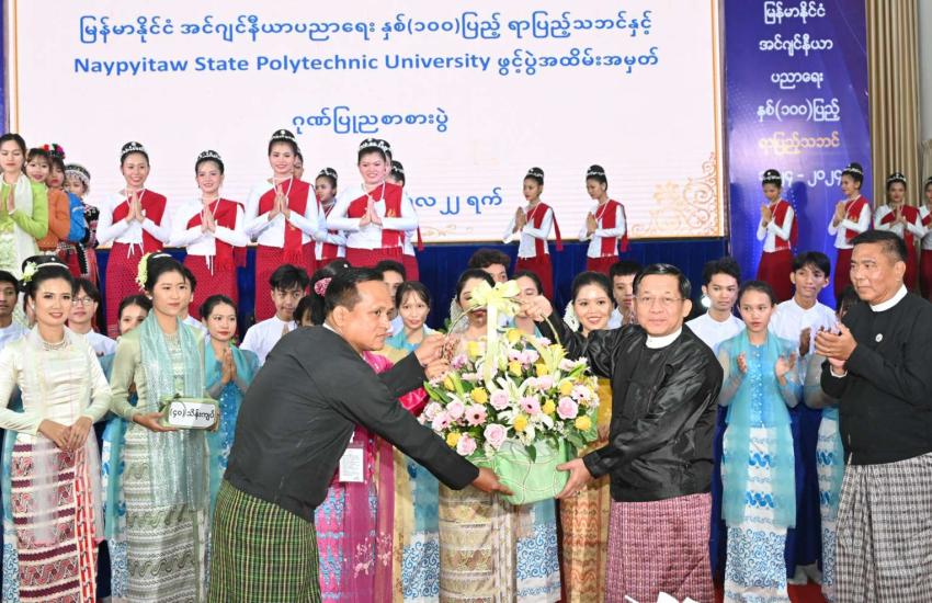မြန်မာနိုင်ငံအင်ဂျင်နီယာပညာရေး နှစ် (၁၀၀)ပြည့် ရာပြည့်သဘင်နှင့် Naypyitaw State Polytechnic University ဖွင့်ပွဲ အထိမ်းအမှတ် ဂုဏ်ပြုညစာစားပွဲအခမ်းအနားကျင်းပ နိုင်ငံတော်စီမံအုပ်ချုပ်ရေးကောင်စီဥက္ကဋ္ဌ နိုင်ငံတော်ဝန်ကြီးချုပ် ဗိုလ်ချုပ်မှူးကြီး မင်းအောင်လှိုင် တက်ရောက်ချီးမြှင့်
