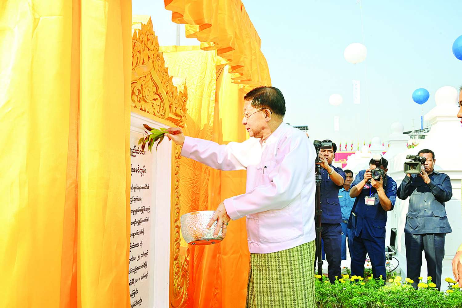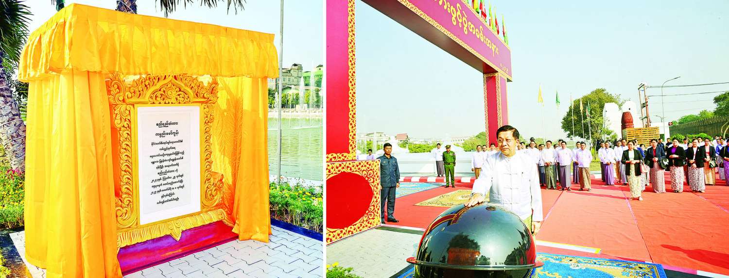 ယင်းနောက် နိုင်ငံတော်စီမံအုပ်ချုပ်ရေးကောင်စီဥက္ကဋ္ဌ နိုင်ငံတော်ဝန်ကြီးချုပ်က တံတားကမ္ပည်းမော်ကွန်းကျောက်စာအား စက်ခလုတ်နှိပ်ဖွင့်လှစ်ပေးပြီး အမွှေးနံ့သာရည်များ ပက်ဖျန်းပေးသည်။
