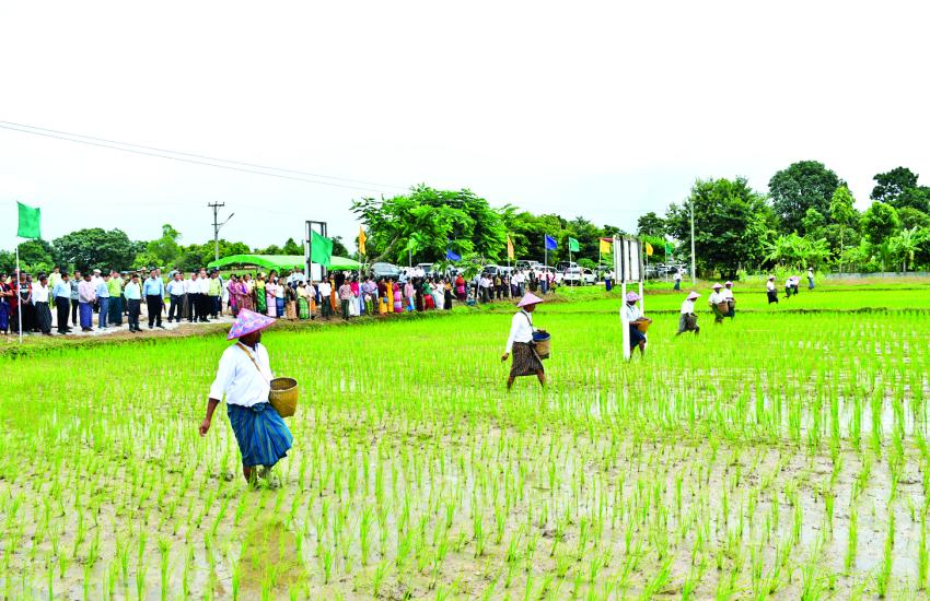 နိုင်ငံတော်စီမံအုပ်ချုပ်ရေးကောင်စီအဖွဲ့ဝင် ပိုးရယ်အောင်သိန်း မိုးစပါး ယူရီးယားဓာတ်မြေ ဩဇာ စုပေါင်းကြဲပက်ခြင်းအခမ်းအနား တက်ရောက်
