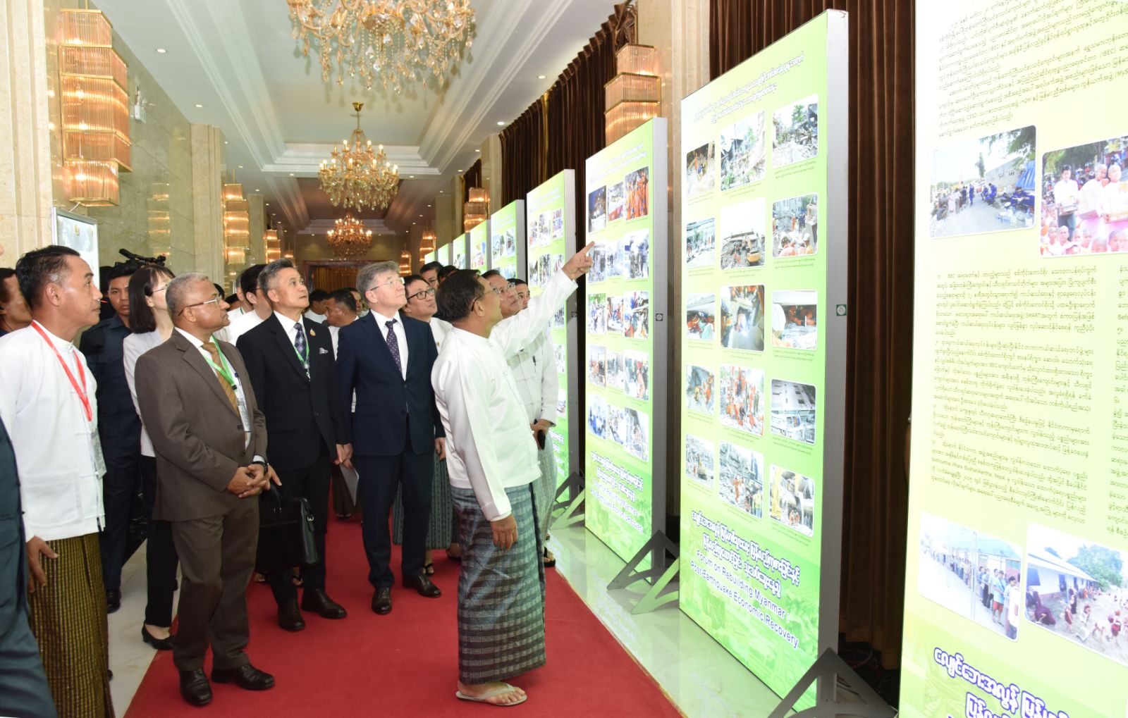 အခမ်းအနားအပြီးတွင် နိုင်ငံတော်စီမံအုပ်ချုပ်ရေးကောင်စီဥက္ကဋ္ဌ နိုင်ငံတော်ဝန်ကြီးချုပ်နှင့် အခမ်းအနား တက်ရောက်လာကြသူများသည် မန္တလေးမြေငလျင်ကြီးကြောင့် ထိခိုက်ပျက်စီးမှုများ၊ ကူညီကယ်ဆယ်ရေးလုပ်ငန်းများနှင့် ပြန်လည်ထူထောင်ရေးလုပ်ငန်းများဆောင်ရွက်မှု မှတ်တမ်းဓာတ်ပုံပြခန်းများအားလှည့်လည် ကြည့်ရှုခဲ့ကြသည်။