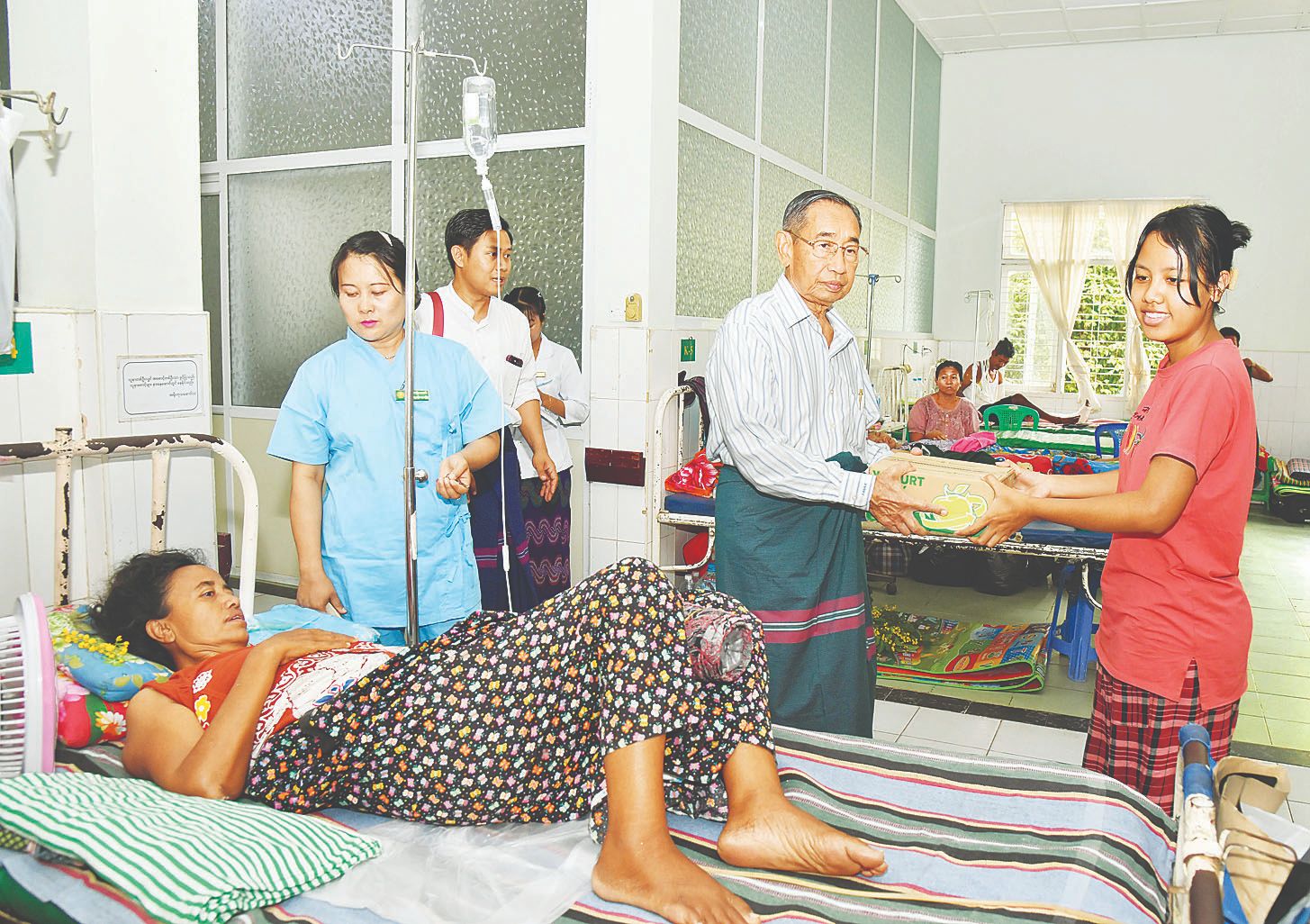 ဦးစွာ ကောင်စီအဖွဲ့ဝင် မန်းငြိမ်းမောင်သည် ပြည်သူ့ဆေးရုံကြီး ခုတင် (၁၀၀၀) ရှိ ဦးနှောက်နှင့် အာရုံကြောကုသဆောင်နှင့် အရိုးကုသဆောင်တို့၌ ငလျင်ဘေးဒဏ်ကြောင့် ထိခိုက်ဒဏ်ရာရရှိခဲ့သည့် လူနာများအား တွေ့ဆုံ၍ ကျန်းမာရေးအခြေအနေများနှင့် နေထိုင်စားသောက်နေမှုအခြေအနေများကို မေးမြန်းအားပေးစကားပြောကြားကာ ဓာတ်ဆားရည်၊ ဒိန်ချဉ်နှင့် အသင့်စားခေါက်ဆွဲဘူးများ ပေးအပ်လှူဒါန်းသည်။