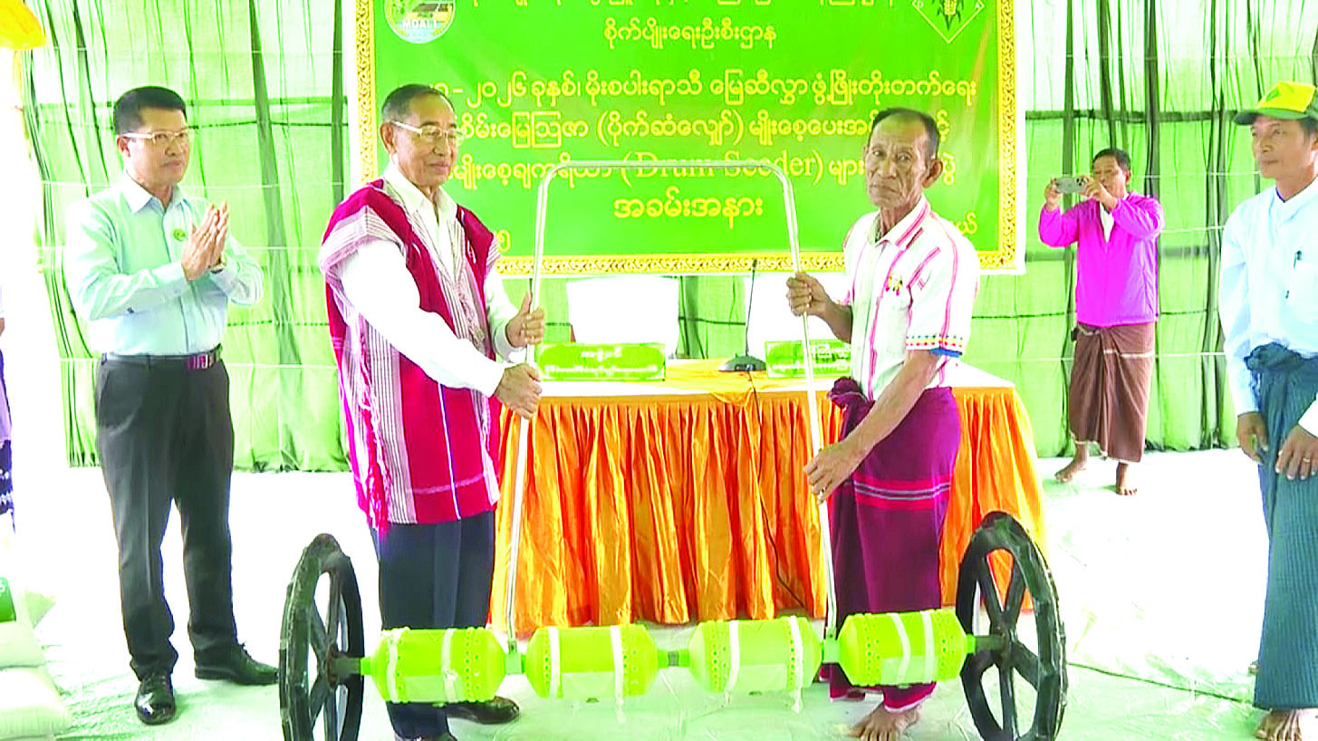 နိုင်ငံတော်စီမံအုပ်ချုပ်ရေးကောင်စီအဖွဲ့ဝင် မန်းငြိမ်းမောင် ဖျာပုံမြို့ အောက်ကွင်းကြီးမျိုးသန့်ခြံ၌ ပြုလုပ်သော သစ်စိမ်းမြေဩဇာ (ပိုက်ဆံလျှော်) မျိုးစေ့ပေးအပ်ခြင်းနှင့် စပါးမျိုးစေ့ချကိရိယာများ တက်ရောက်ပေးအပ်