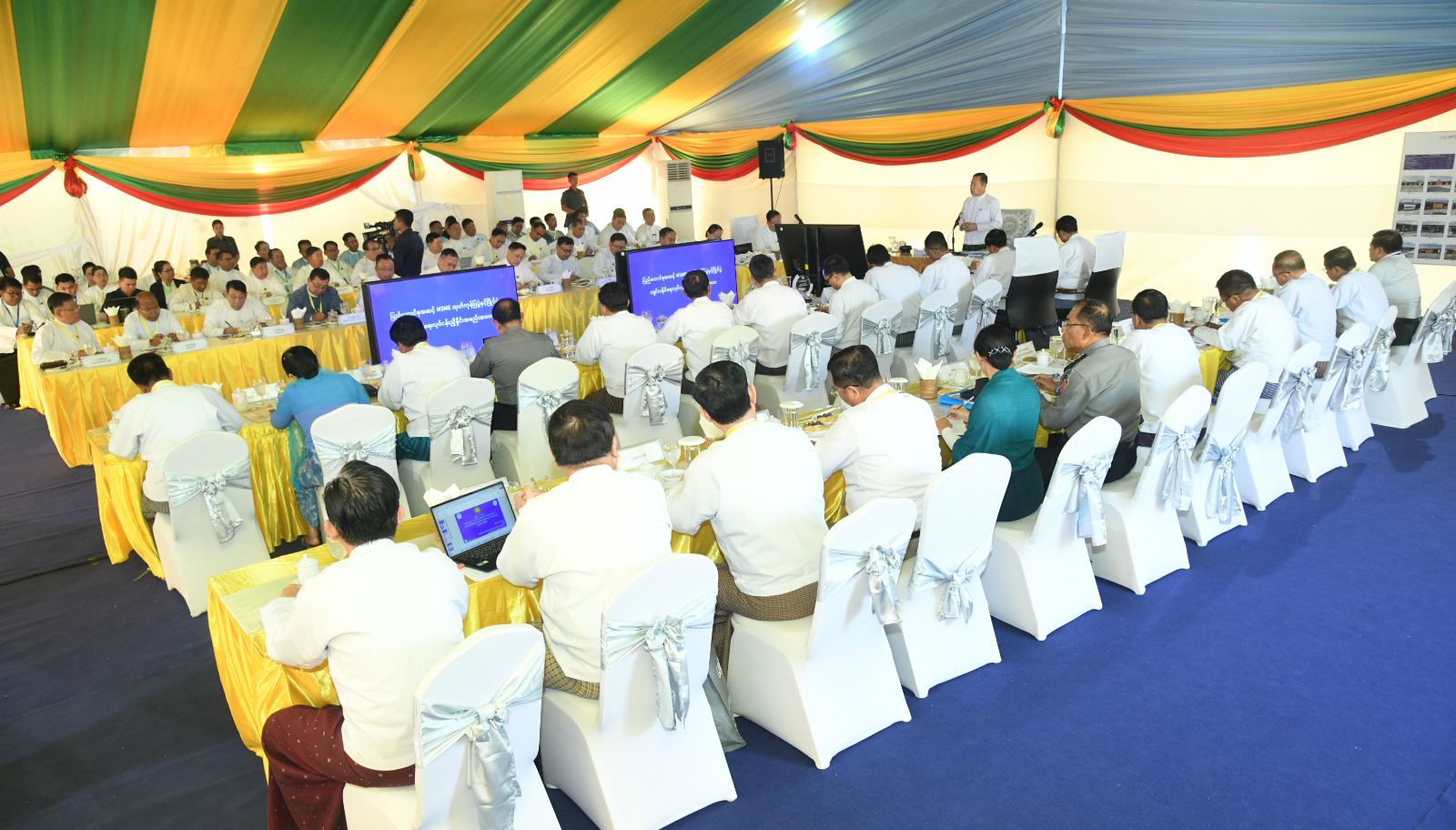 ယင်းနောက် ကျင်းပရေးလုပ်ငန်းကော်မတီဥက္ကဋ္ဌ စက်မှုဝန်ကြီးဌာန ဒုတိယဝန်ကြီး ဦးရင်မောင်ညွန့် က ဆပ်ကော်မတီများ ဖွဲ့စည်းထားရှိမှုနှင့် ပြည်ထောင်စုအဆင့် MSME ထုတ်ကုန်ပြပွဲနှင့် ပြိုင်ပွဲ ကျင်းပနိုင်ရေး စီမံဆောင်ရွက်ထားရှိမှု အခြေအနေများကို ရှင်းလင်းတင်ပြသည်။