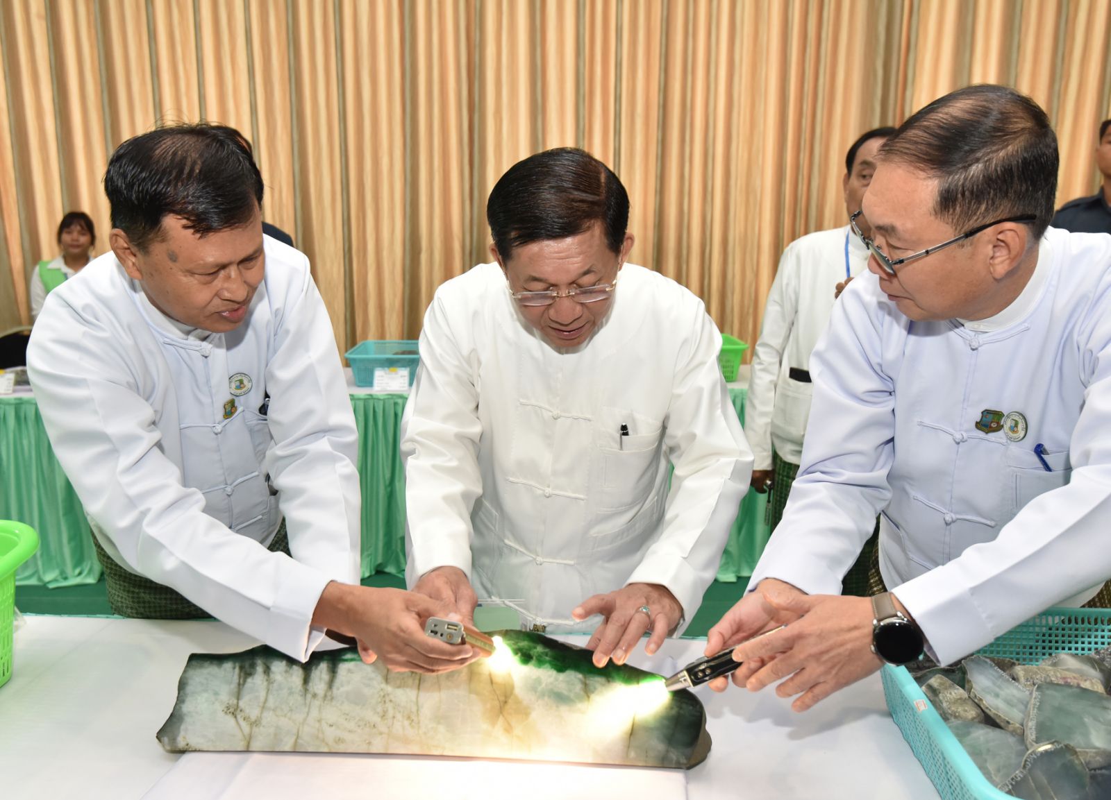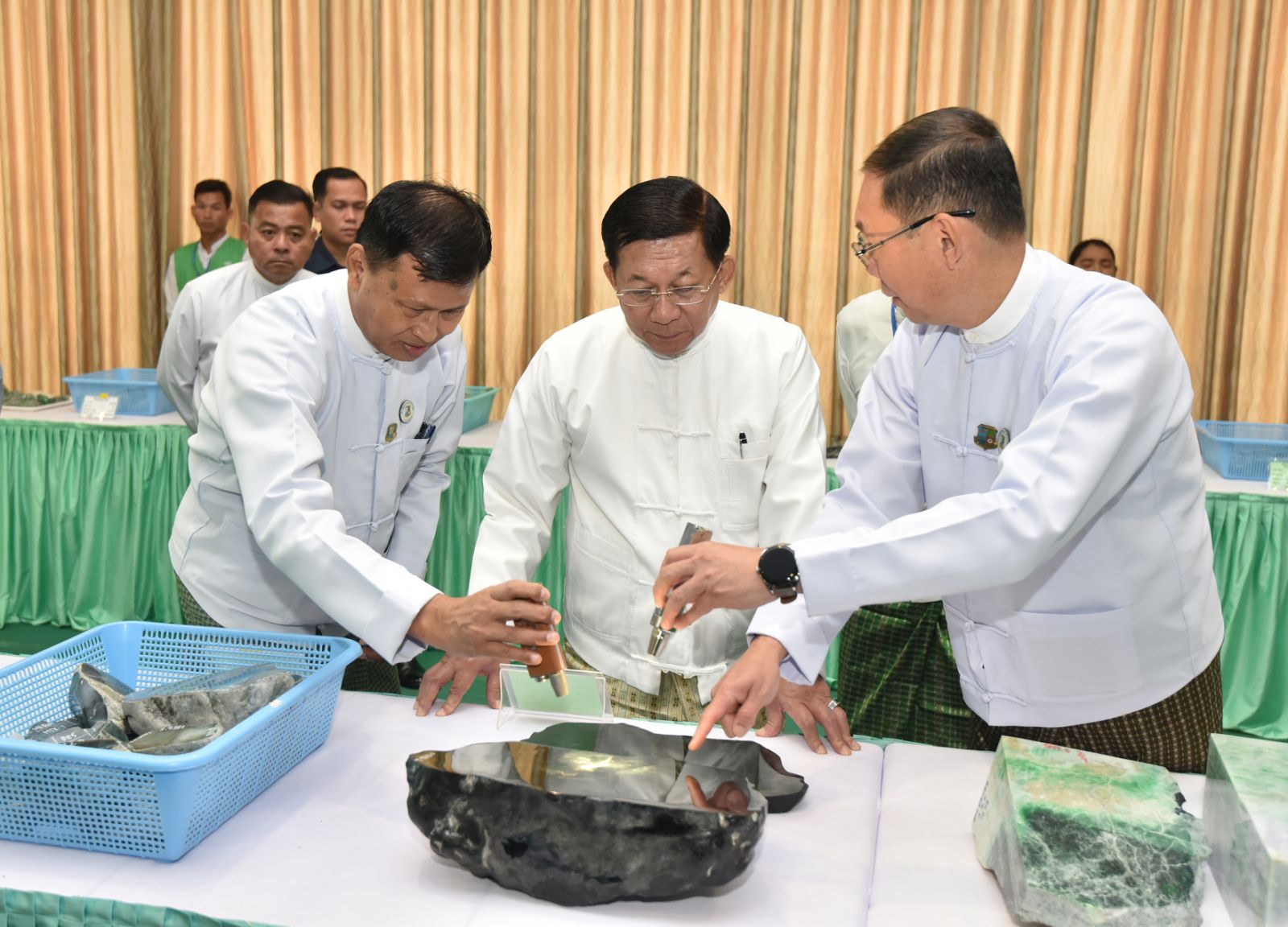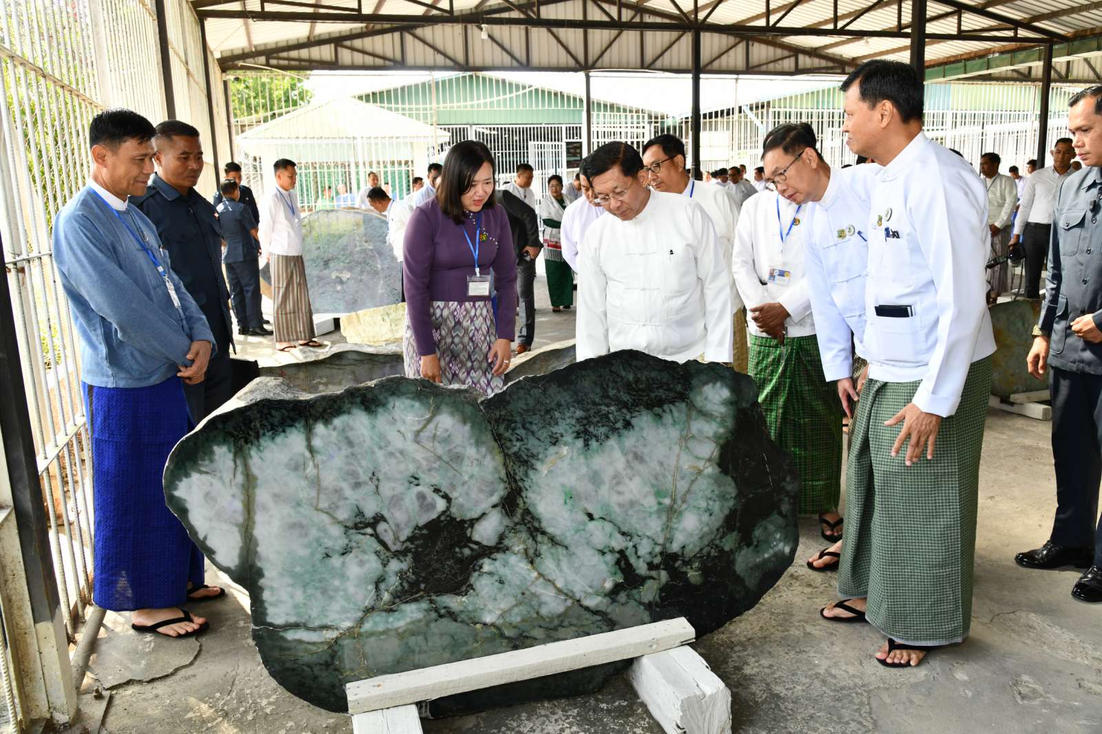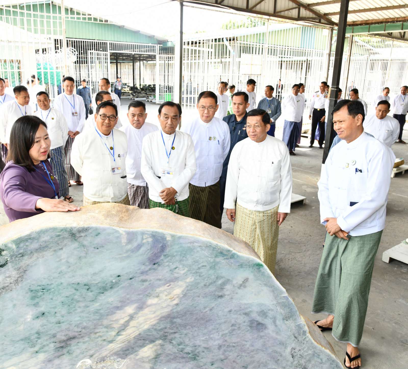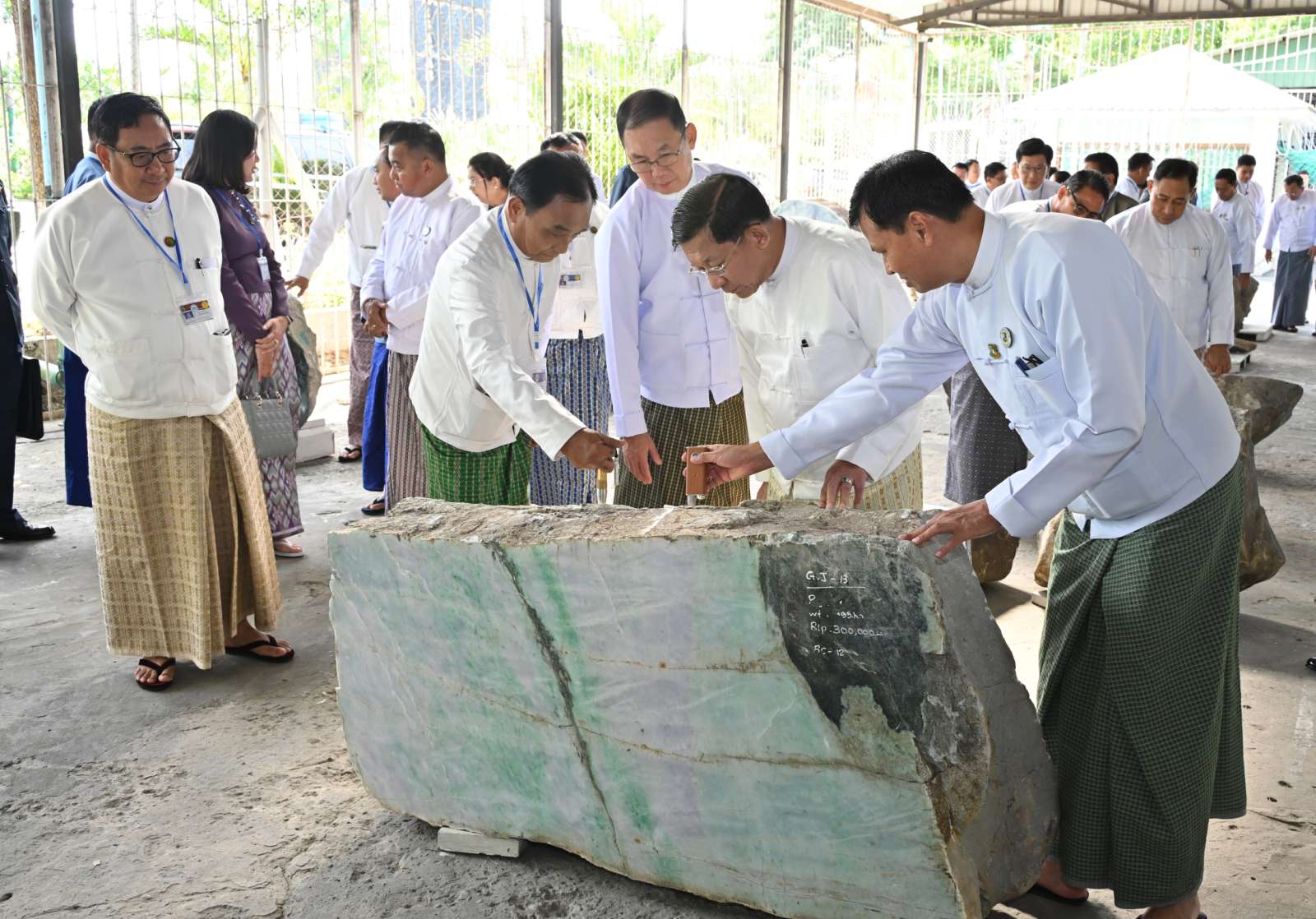 ထို့နောက် နိုင်ငံတော်စီမံအုပ်ချုပ်ရေးကောင်စီဥက္ကဋ္ဌ နိုင်ငံတော်ဝန်ကြီးချုပ်နှင့် အဖွဲ့ဝင်များသည် ပုဂ္ဂလိက ကျောက်မျက်ရတနာ အချောထည် အရောင်းပြခန်းများ ဖွင့်လှစ်ရောင်းချနေမှုကို လိုက်လံ ကြည့်ရှု အားပေးပြီး ခန်းမအပြင်ဘက်တွင် ခင်းကျင်းပြသထားသည့် ကျောက်စိမ်းရိုင်းအတွဲများကို လိုက်လံကြည့်ရှု စစ်ဆေးသည်။