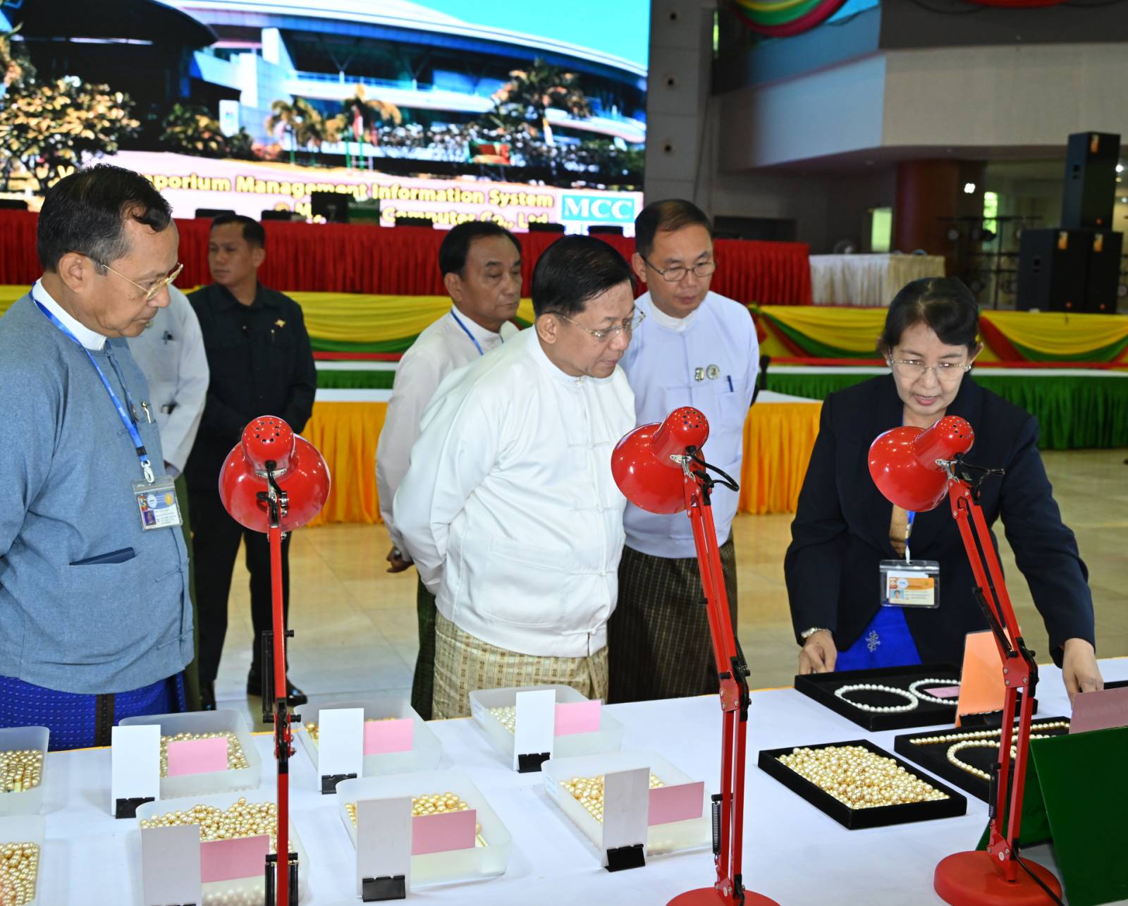 ယင်းနောက် နိုင်ငံတော်စီမံအုပ်ချုပ်ရေးကောင်စီဥက္ကဋ္ဌ နိုင်ငံတော်ဝန်ကြီးချုပ်နှင့် အခမ်းအနား တက်ရောက်လာကြသူများသည် ၂၀၂၄ ခုနှစ်၊ နှစ်လယ်မြန်မာ့ကျောက်မျက်ရတနာပြပွဲ၌ ရောင်းချရန် မဏိရတနာ ကျောက်စိမ်းခန်းမအတွင်း ပြသထားသော ကျောက်စိမ်း၊ ကျောက်မျက်အတွဲများနှင့် ပုလဲအတွဲများကို လိုက်လံကြည့်ရှုစစ်ဆေးပြီး တာဝန်ရှိသူများ၏ ရှင်းလင်းတင်ပြမှုအပေါ် နိုင်ငံတော် စီမံအုပ်ချုပ်ရေးကောင်စီ ဥက္ကဋ္ဌ နိုင်ငံတော်ဝန်ကြီးချုပ်က လိုအပ်သည်များ လမ်းညွှန်မှာကြားသည်။