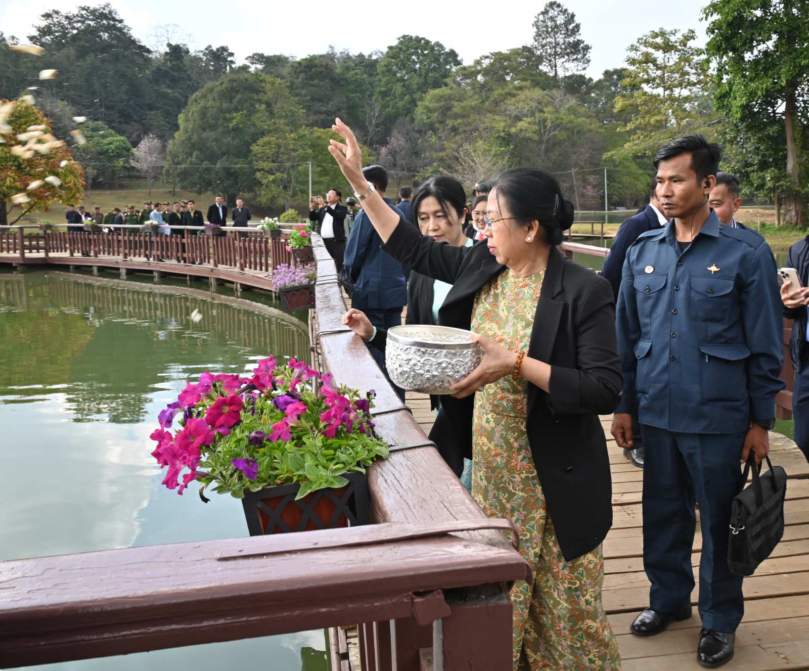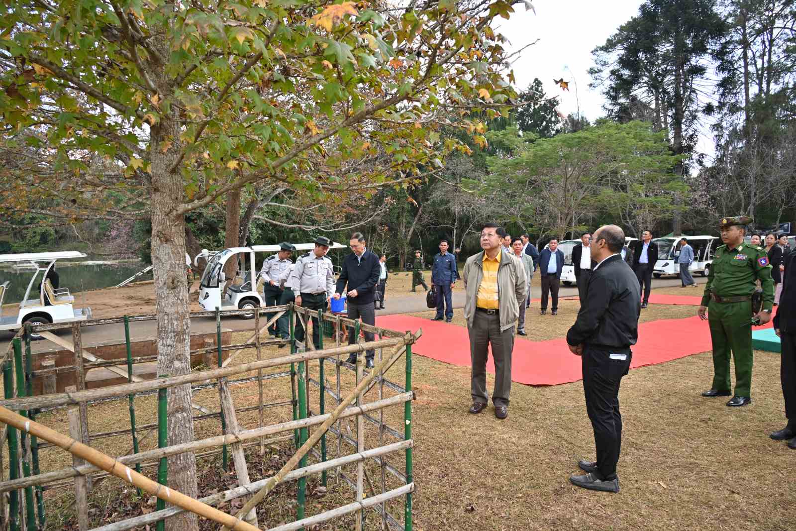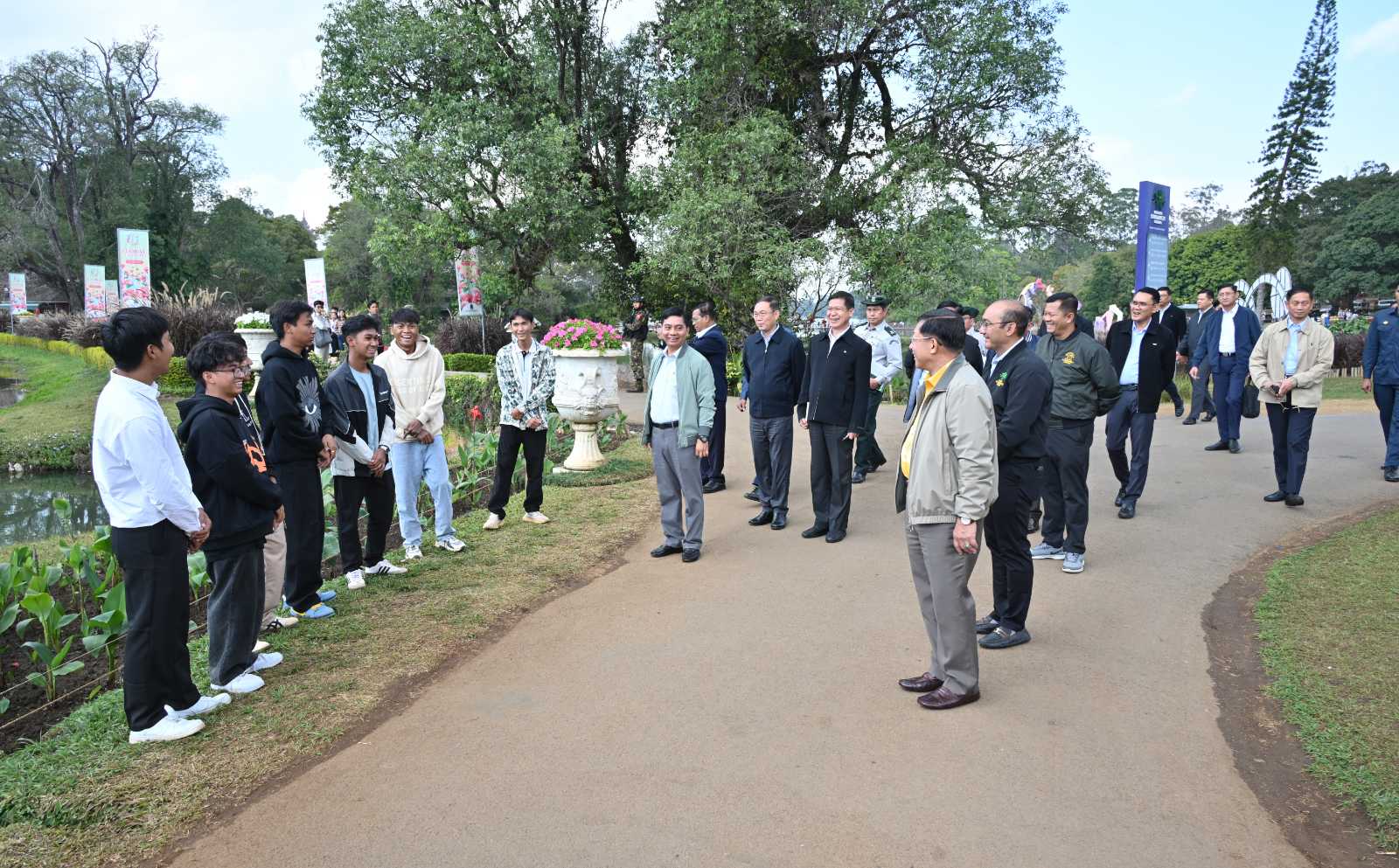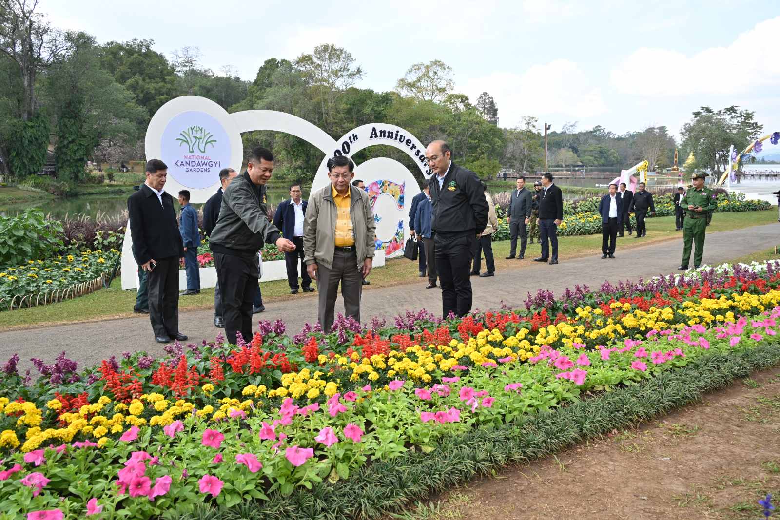 ယင်းနောက် နိုင်ငံတော်စီမံအုပ်ချုပ်ရေးကောင်စီဥက္ကဋ္ဌ နိုင်ငံတော်ဝန်ကြီးချုပ်နှင့်ဇနီး၊ အဖွဲ့ဝင်များသည် အမျိုးသားကန်တော်ကြီးဥယျာဉ်သို့ ရောက်ရှိကြပြီး အမျိုးသားကန်တော်ကြီးဥယျာဉ် နှစ်(၁၀၀)ပြည့်အထိမ်းအမှတ် (၁၇)ကြိမ်မြောက် ပန်းပွဲတော်အား စည်ကားသိုက်မြိုက်စွာဖြင့် ကျင်းပပြုလုပ်ထားရှိမှုများအား ကြည့်ရှုအားပေးပြီး အပန်းဖြေလာရောက်ကြသည့် ပြည်သူများအား ရင်းရင်းနှီးနှီးနှုတ်ဆက်သည်။