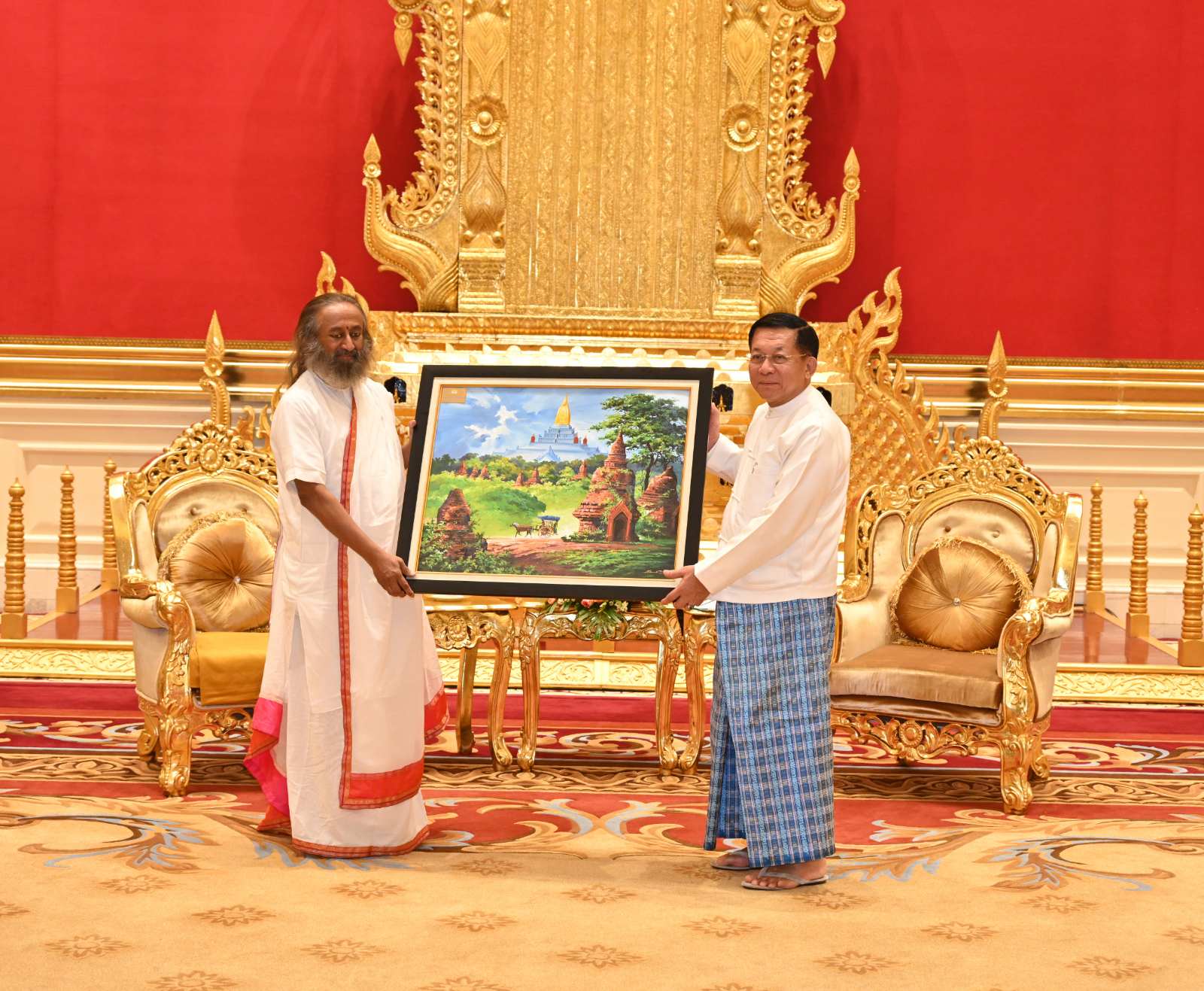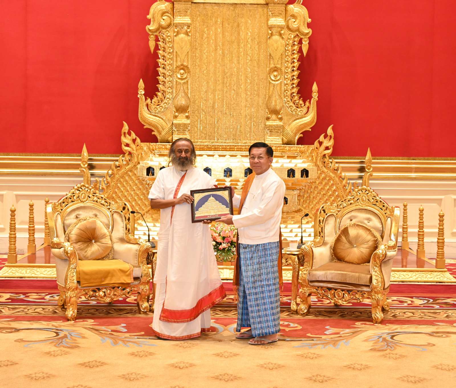 နိုင်ငံတော်စီမံအုပ်ချုပ်ရေးကောင်စီဥက္ကဋ္ဌ နိုင်ငံတော်ဝန်ကြီးချုပ် ဗိုလ်ချုပ်မှူးကြီး မင်းအောင်လှိုင် အိန္ဒိယနိုင်ငံမှ လူသားချင်းစာနာထောက်ထားမှုခေါင်းဆောင်နှင့် ငြိမ်းချမ်းရေးသံတမန်ကြီး Gurudev Sri Sri Ravi Shankar အား လက်ခံတွေ့ဆုံ