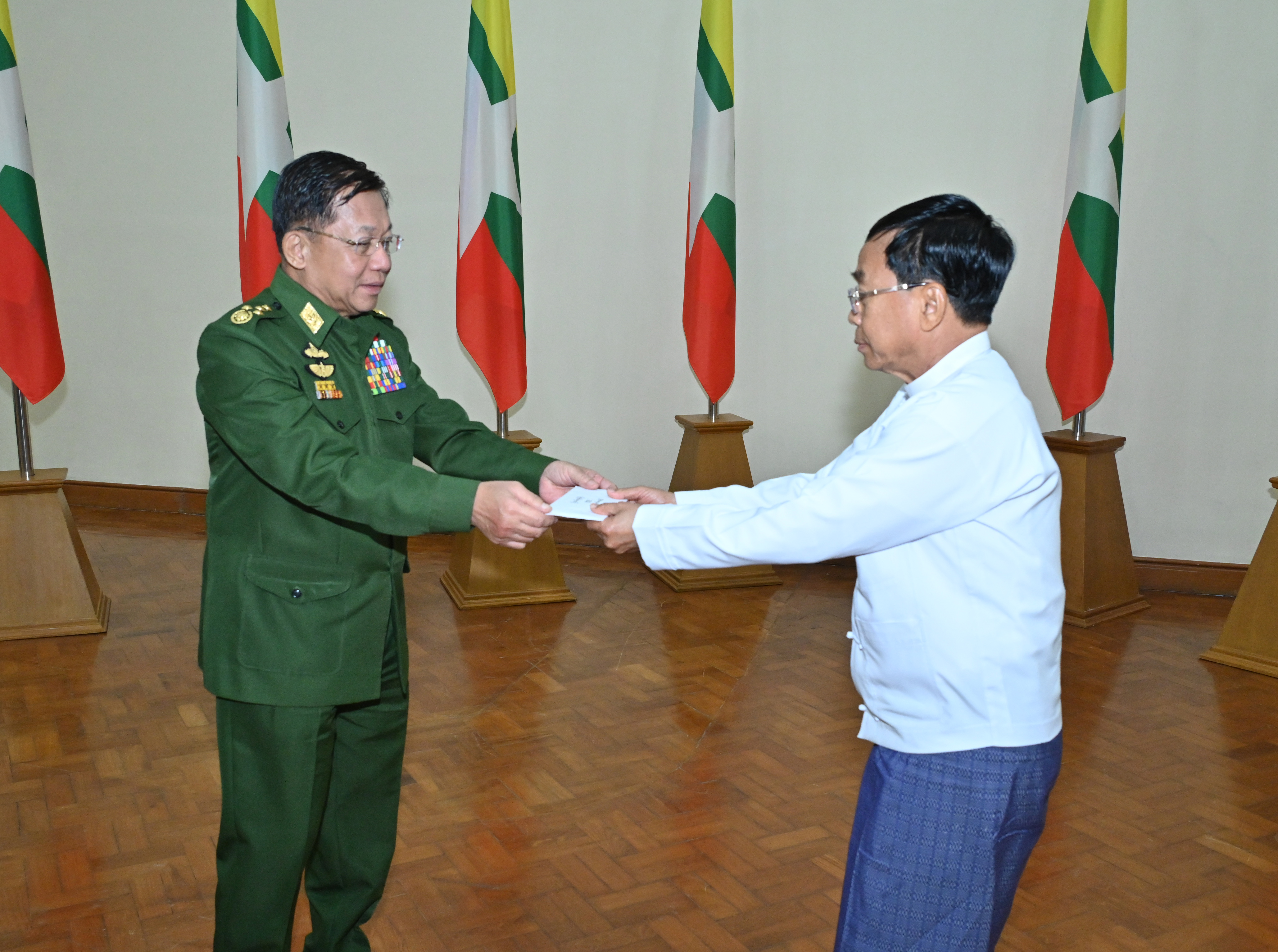 ထို့နောက် နိုင်ငံတော်စီမံအုပ်ချုပ်ရေးကောင်စီဥက္ကဋ္ဌ နိုင်ငံတော်ဝန်ကြီးချုပ်က အကြမ်းဖက်ဖြစ်စဉ်များကြောင့် ယာယီနေရပ်စွန့်ခွာနေရသည့် ပြည်သူများအတွက် ထောက်ပံ့ငွေများကိုပေးအပ်ရာ နေပြည်တော်ကောင်စီအပါအဝင် တိုင်းဒေသကြီးနှင့် ပြည်နယ်ဝန်ကြီးချုပ်များက အသီးသီးလက်ခံရယူကြသည်။