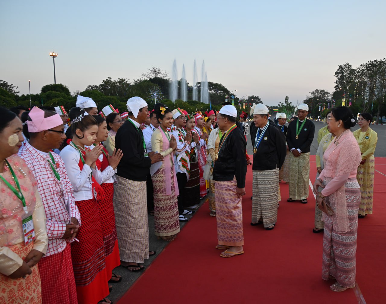 ထို့နောက် နိုင်ငံတော်စီမံအုပ်ချုပ်ရေးကောင်စီဥက္ကဋ္ဌ နိုင်ငံတော်ဝန်ကြီးချုပ်နှင့်ဇနီး၊ ကောင်စီဒုတိယဥက္ကဋ္ဌ ဒုတိယဝန်ကြီးချုပ်နှင့်ဇနီးတို့သည် ဂုဏ်ပြုညစာစားပွဲသို့ တက်ရောက် လာကြသည့် တိုင်းဒေသကြီးနှင့်ပြည်နယ်များမှ တိုင်းရင်းသားရိုးရာယဉ်ကျေးမှုအဖွဲ့များ၊ နိုင်ငံရေးပါတီများမှ ဥက္ကဋ္ဌများနှင့် ကိုယ်စားလှယ်များ၊ NCA စာချုပ် လက်မှတ်ရေးထိုးထားသည့် တိုင်းရင်းသားလက်နက်ကိုင်အဖွဲ့အစည်းများမှ ခေါင်းဆောင်များနှင့် ကိုယ်စားလှယ်များ၊ တိုင်းဒေသကြီးနှင့် ပြည်နယ်များမှ စီးပွားရေးရာဝန်ကြီးများနှင့် တိုင်းရင်းသားလူမျိုးရေးရာဝန်ကြီးများ၊ တိုင်းဒေသကြီးနှင့် ပြည်နယ်များမှ MSME လုပ်ငန်းရှင်များ၊ ကာကွယ်ရေးဦးစီးချုပ်ရုံးမှ အဆင့်မြင့်တပ်မတော်အရာရှိကြီးများနှင့်ဇနီးများ၊ ပြည်ထောင်စုဝန်ကြီးများ၊ ပြည်ထောင်စုအဆင့်ပုဂ္ဂိုလ်များနှင့်ဇနီးများ၊ နိုင်ငံတော်စီမံအုပ်ချုပ်ရေးကောင်စီဝင်များနှင့်ဇနီးများ၊ ကောင်စီတွဲဖက်အတွင်းရေးမှူးနှင့်ဇနီး၊ အတွင်းရေးမှူးနှင့် ဇနီးတို့အား ရင်းရင်းနှီးနှီး လိုက်လံနှုတ်ဆက်ကြသည်။